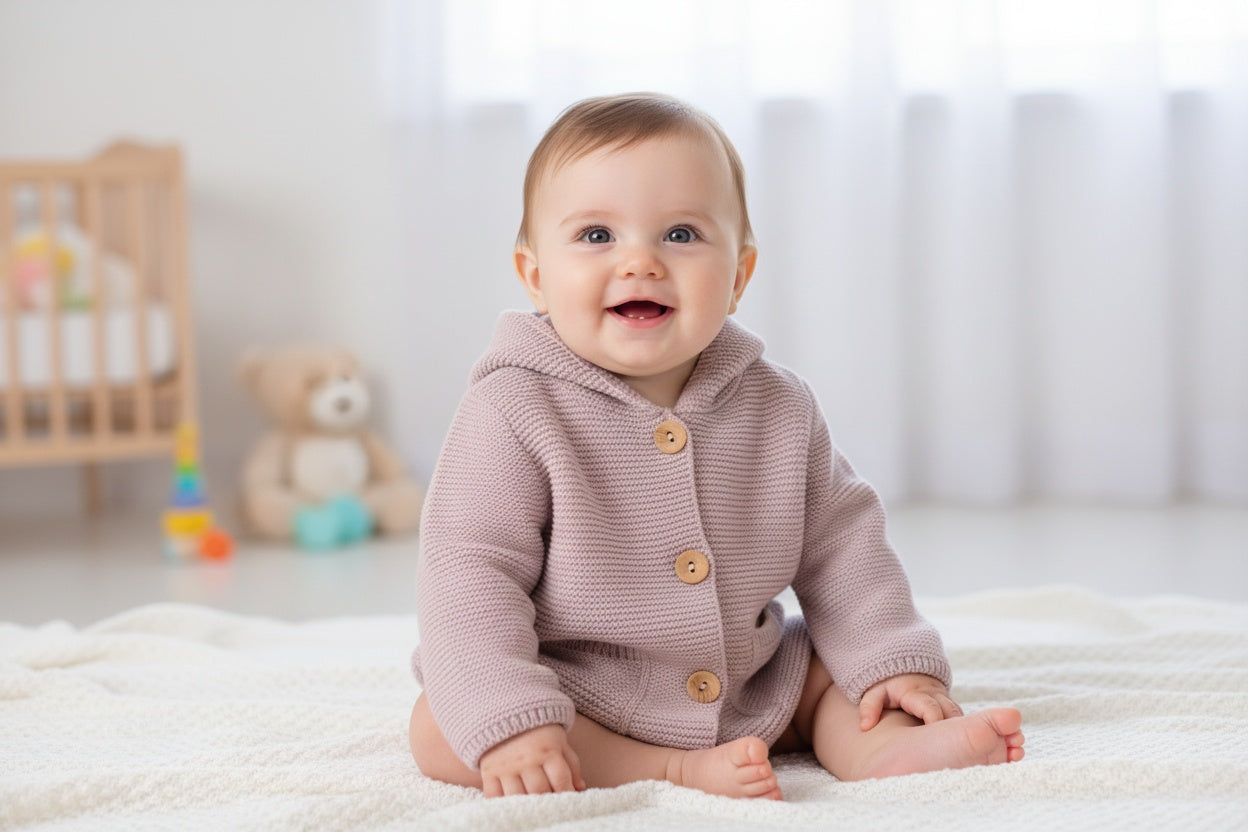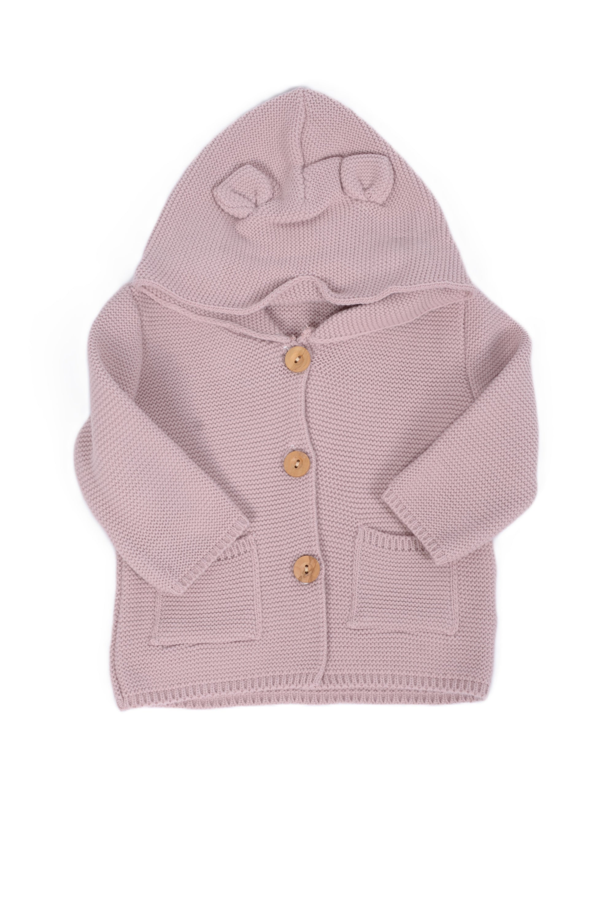 Сладка и стилна бебешка жилетка в нежен розов цвят, изработена от меко и топло плетиво. Дизайнът е с качулка, украсена с малки ушички, които добавят закачлив и очарователен акцент. Жилетката има три дървени копчета отпред и две практични джобчета. Подходяща е за разходки, ежедневие и уютни моменти у дома.