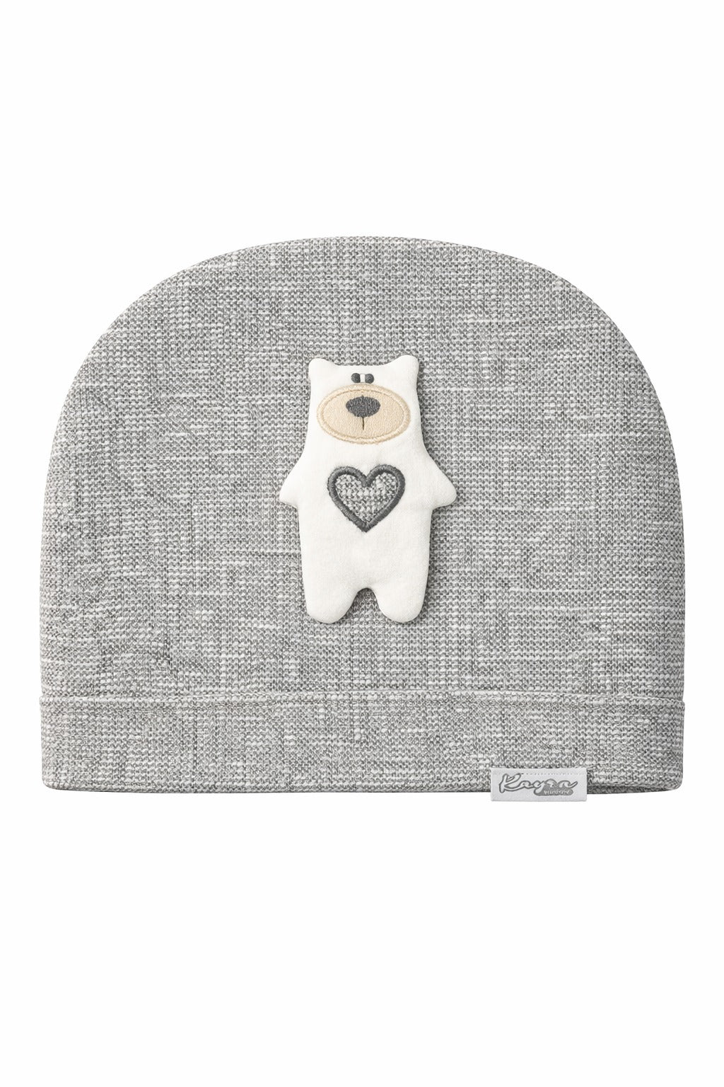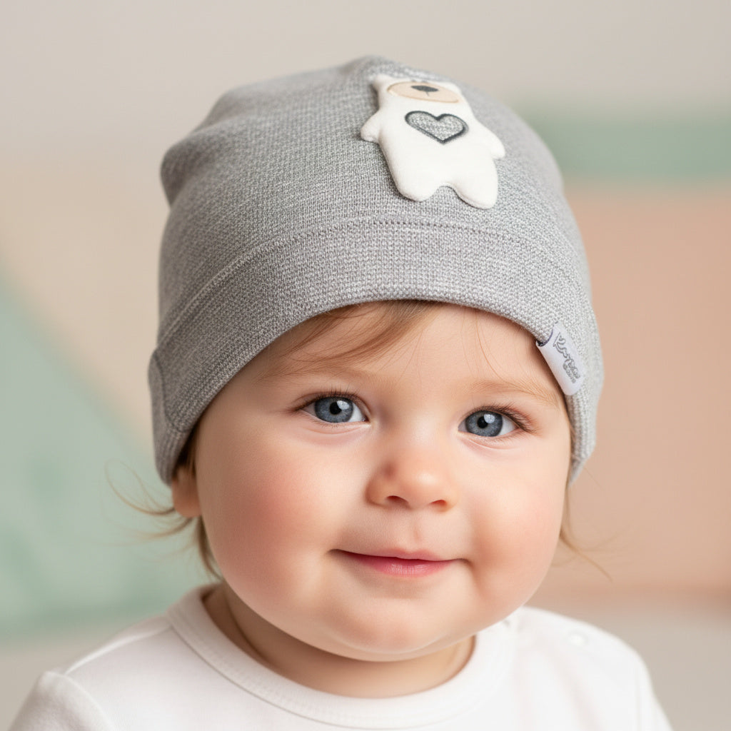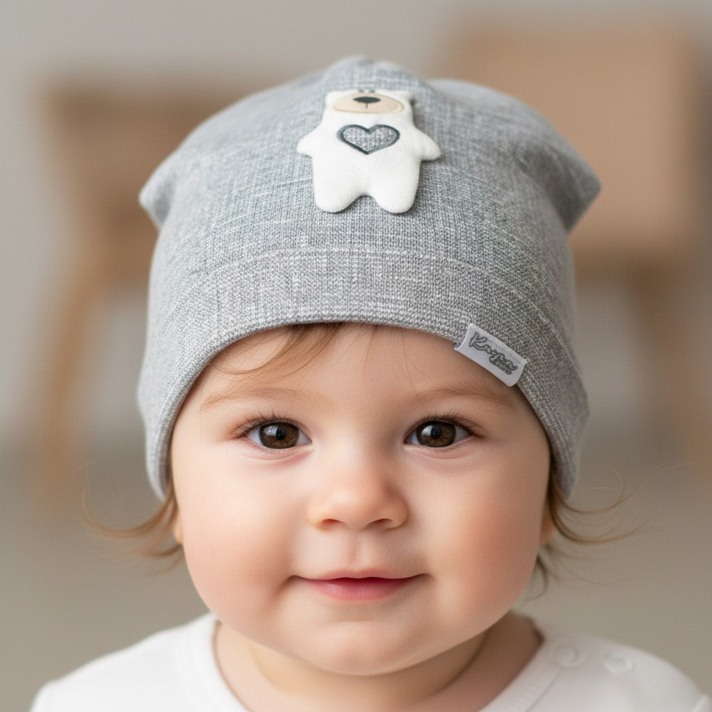 Очарователна бебешка шапка в топъл сив нюанс, създадена да осигури комфорт и защита за малките главички. Декоративната апликация с мече и сърчице придава сладък и уютен завършек.