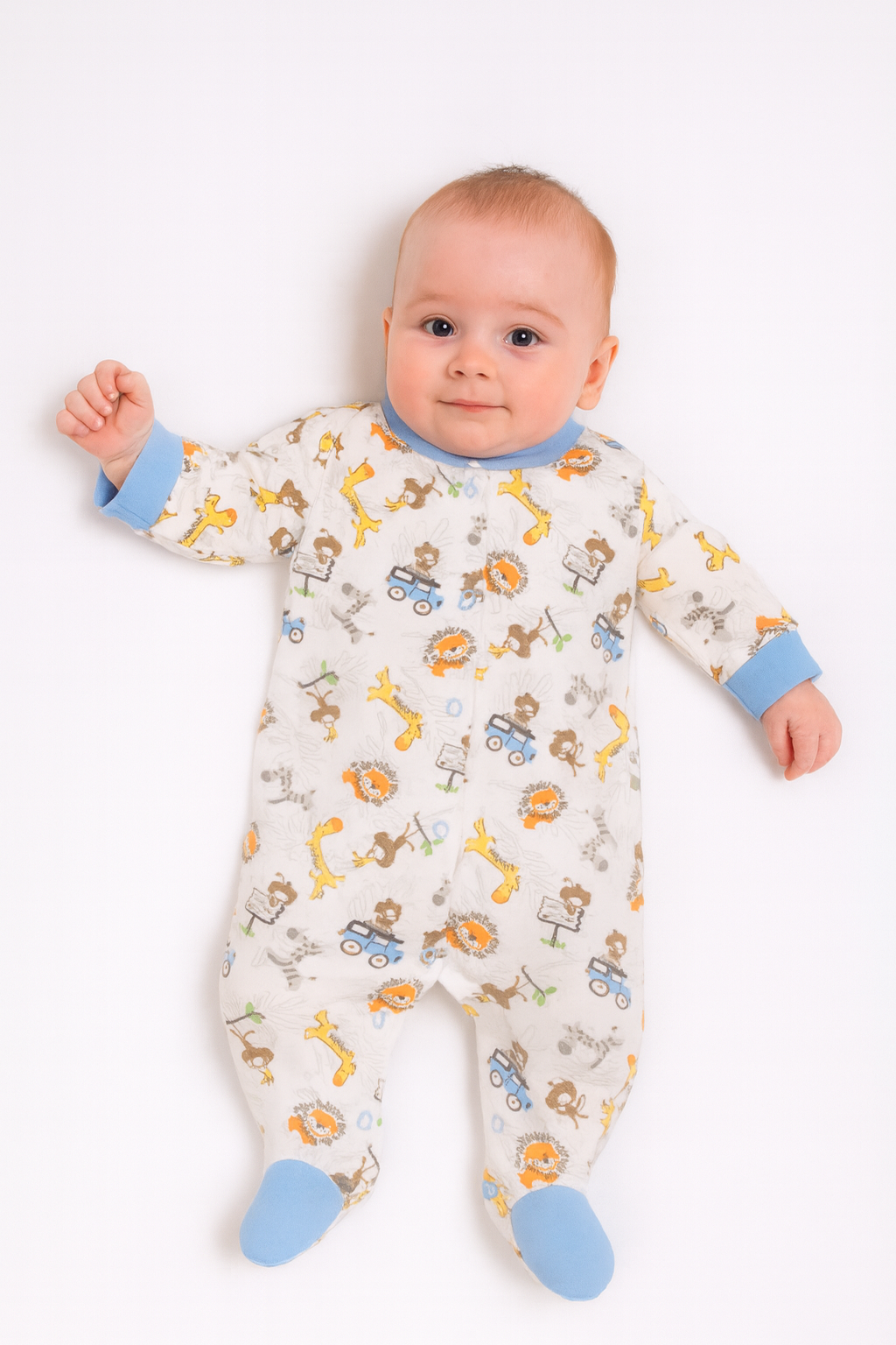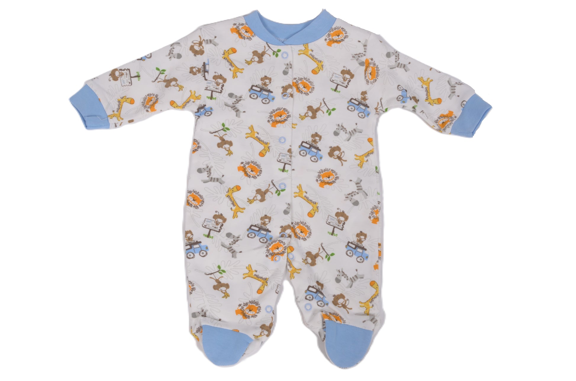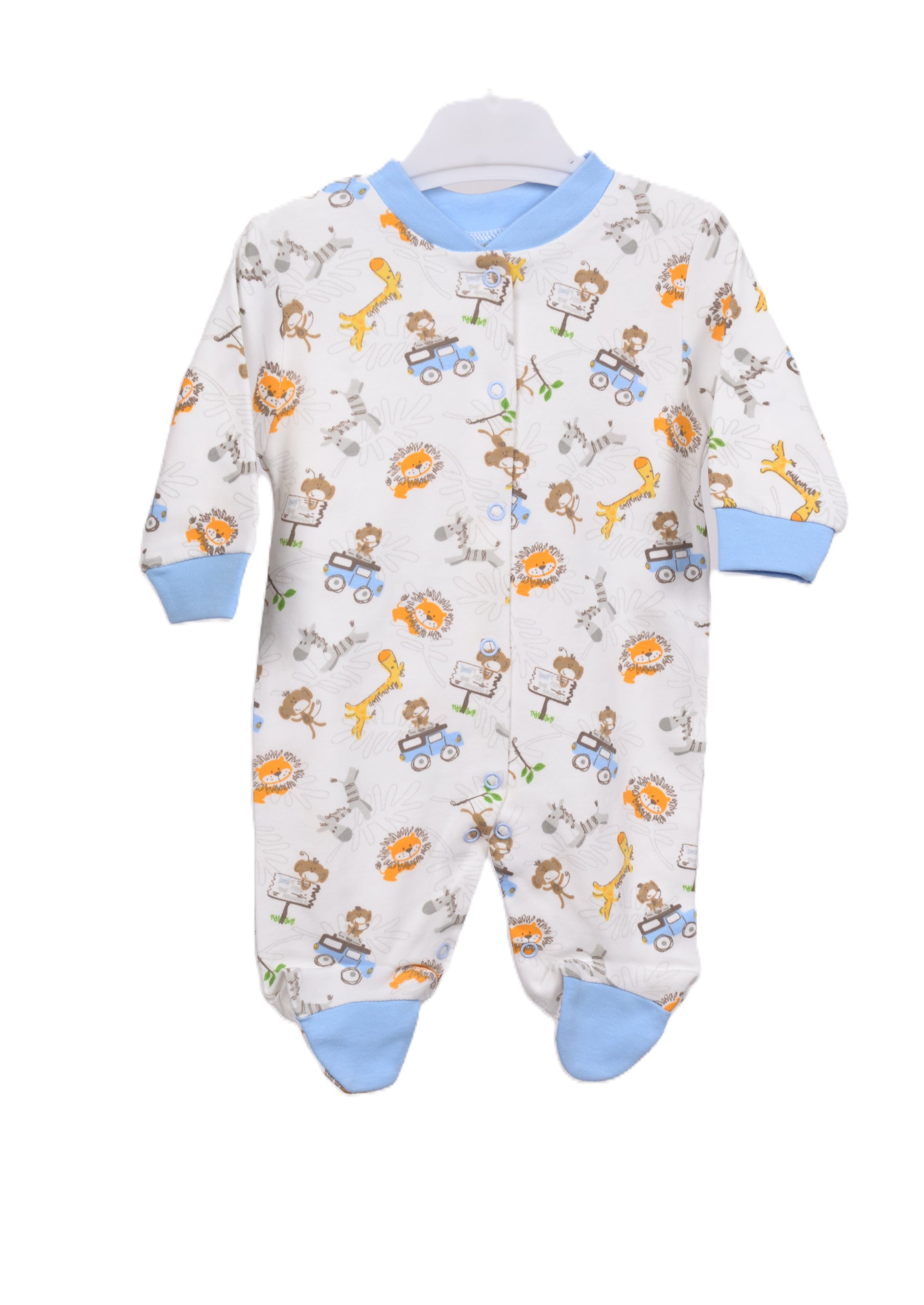 Очарователен бебешки гащеризон с дълъг ръкав, изработен от мек и удобен памук. Десенът е пъстър и весел, с животни от сафари – лъвчета, маймунки, жирафи и зебри, които ще внесат настроение във всеки ден. Закопчава се с копчета по цялата дължина за лесно и удобно обличане. Ръкавите и крачетата завършват със светлосини кантове за свеж акцент.