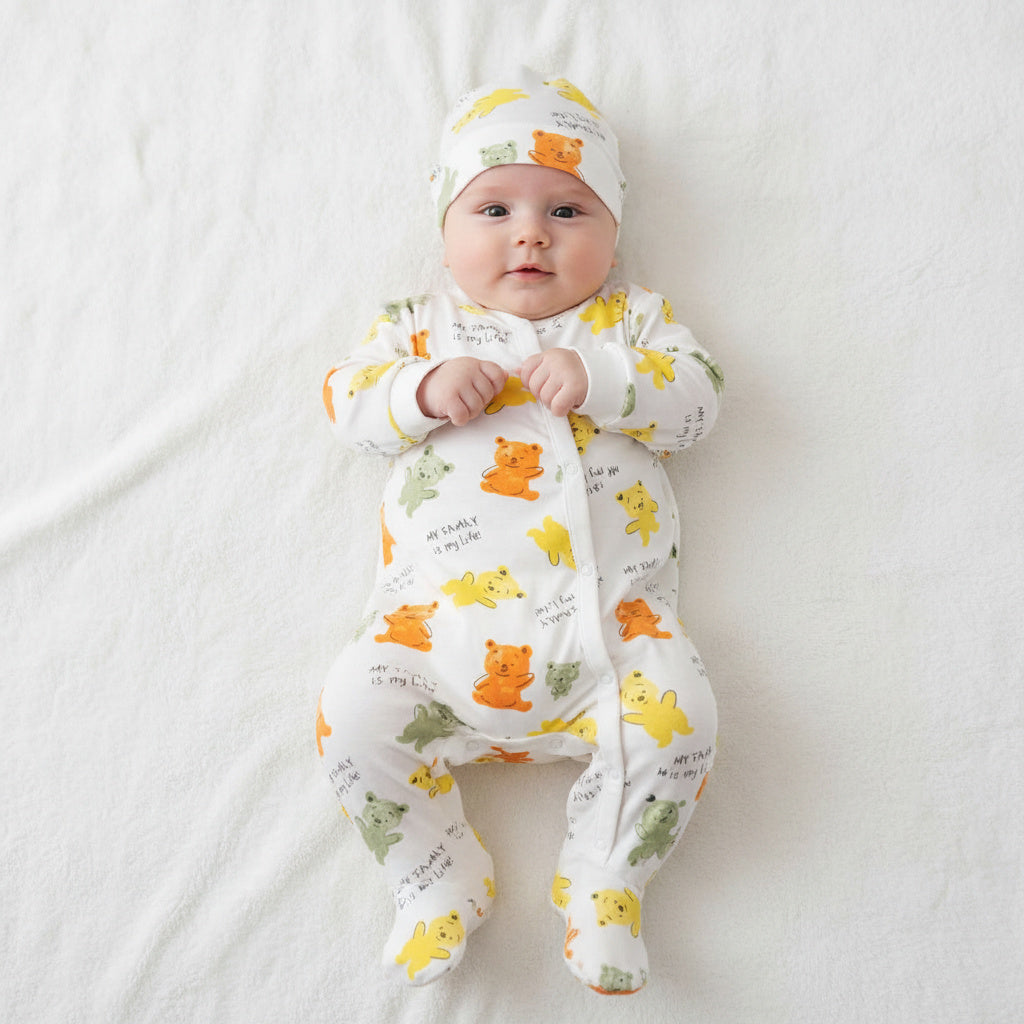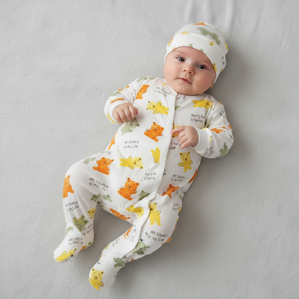Весел и уютен бебешки гащеризон, създаден да носи усмивки и комфорт още от първите дни. Моделът „My Family“ впечатлява с пъстър принт на сладки мечета и надписи, които придават закачливо и топло излъчване.