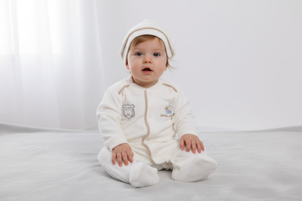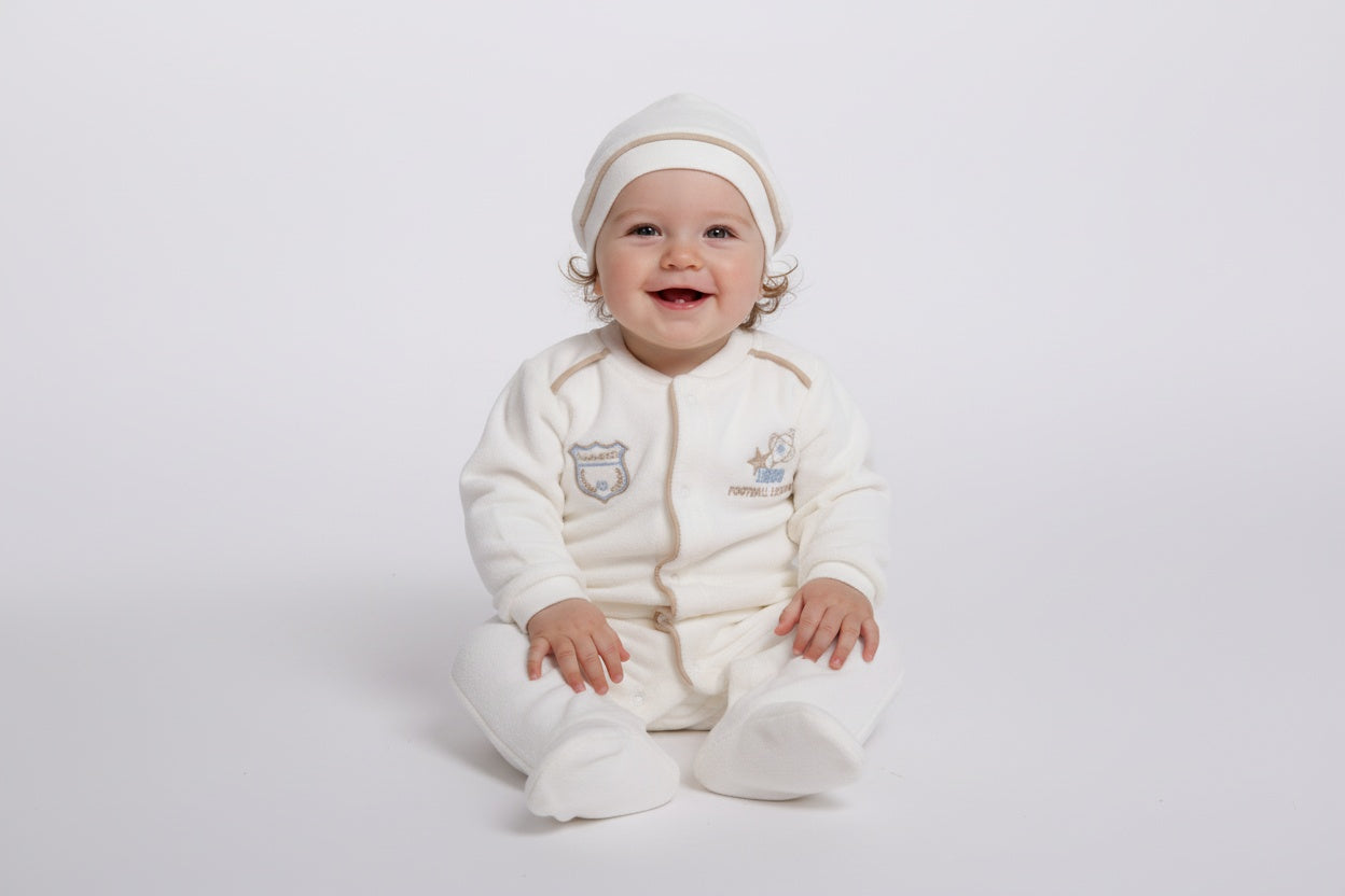 Стилен и удобен бебешки гащеризон в млечно бял цвят с малки спортни бродерии, които придават игриво излъчване. Моделът е с дълги ръкави и крачоли със закрити крачета за повече топлина и комфорт. Закопчава се с тик-так копчета по цялата дължина за лесно и бързо обличане. В комплекта е включена и мека шапчица в същия стил, която допълва визията.