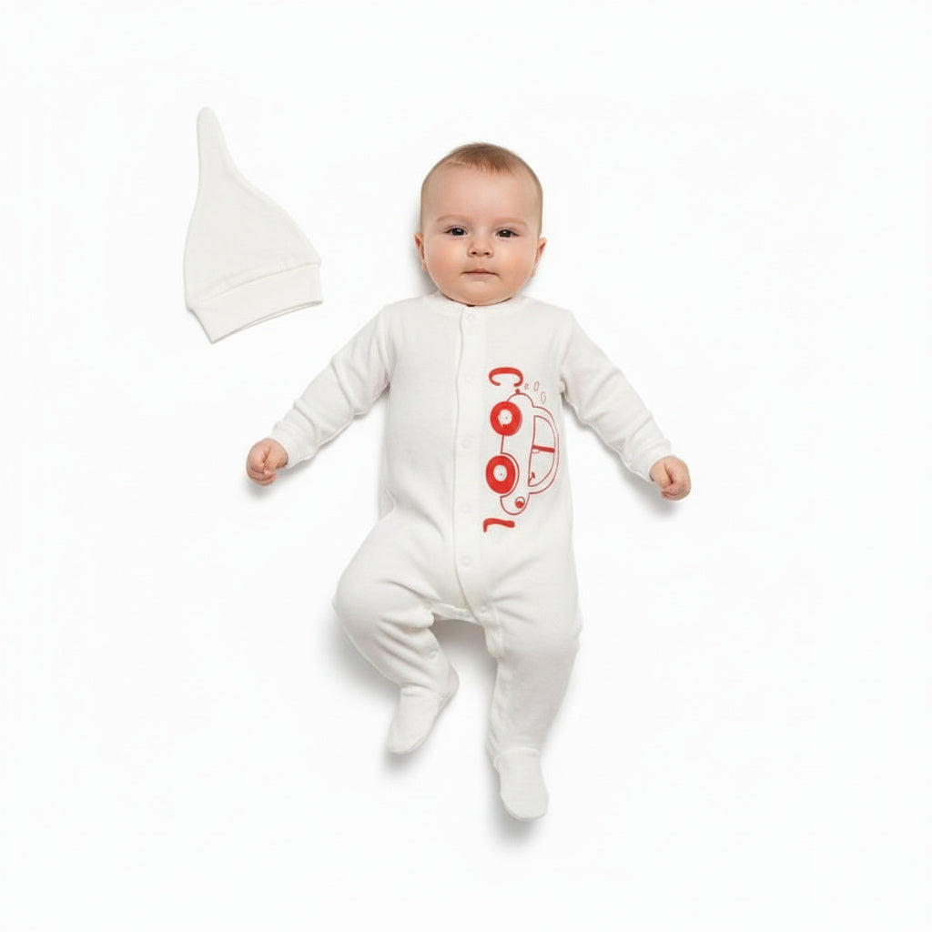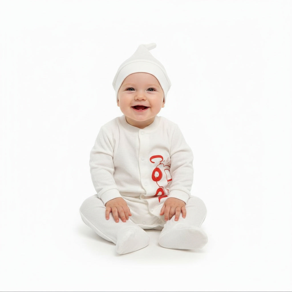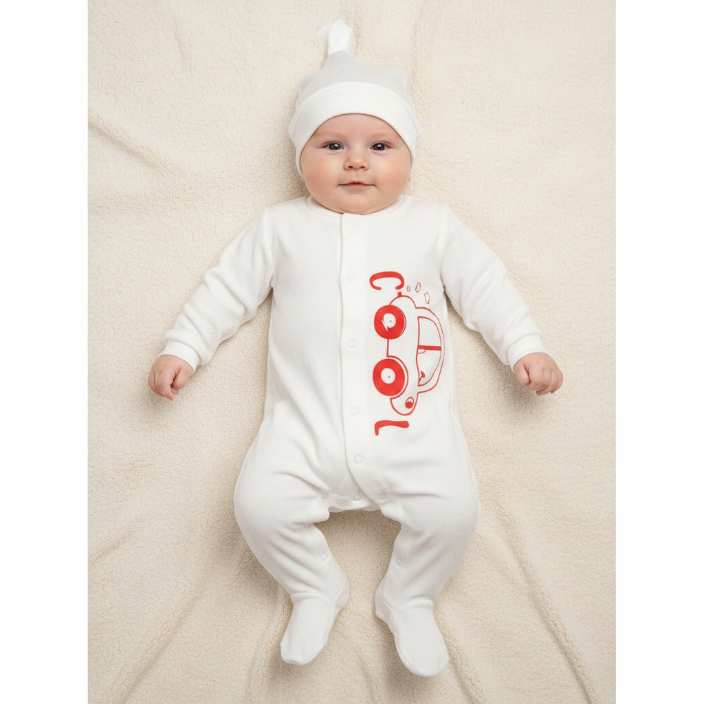 Нежен и стилен бебешки гащеризон в чисто бял цвят, създаден с внимание към комфорта и детайла. Червената количка и малкият надпис отпред придават сладка и игрива нотка на изчистения дизайн.