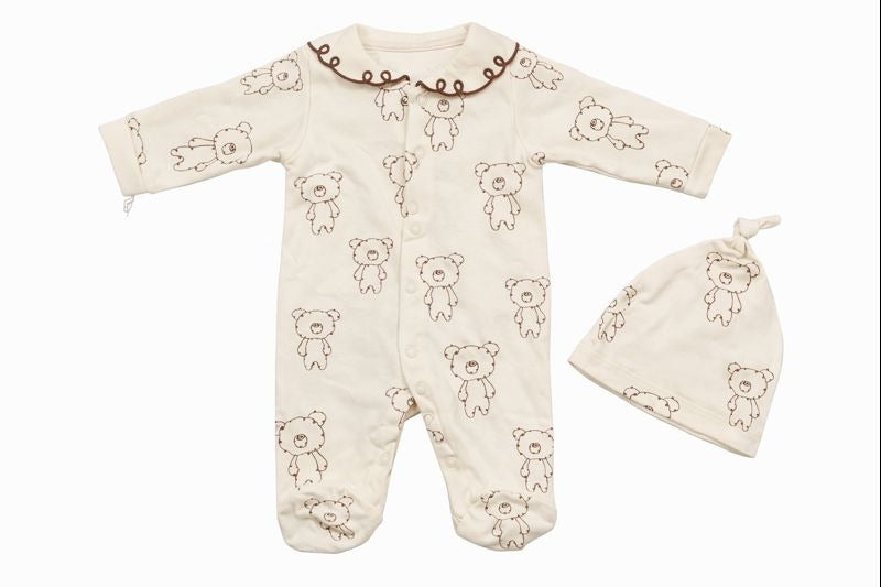 Изключително нежен бебешки гащеризон в чист бял цвят, създаден с внимание към комфорта и деликатността на новороденото. Сладката апликация с кафяви мечета придава топла, уютна и миловидна визия, която носи усещане за нежност и грижа.