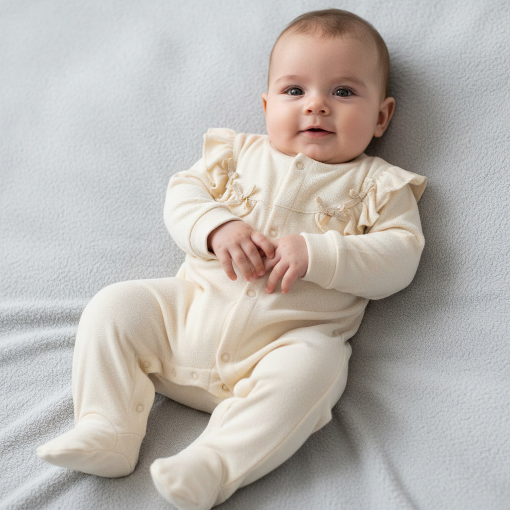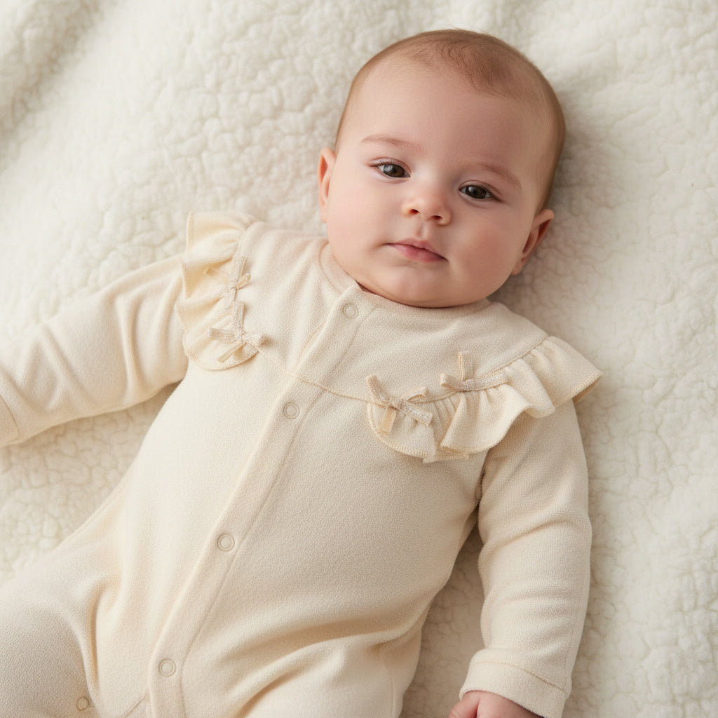 Изчистен, мек и изключително нежен – гащеризонът „Ivory Grace“ е създаден за уютни моменти и спокойни първи дни. Фините къдрички и деликатните декоративни шевове придават елегантен и романтичен акцент, без да отнемат от комфорта.