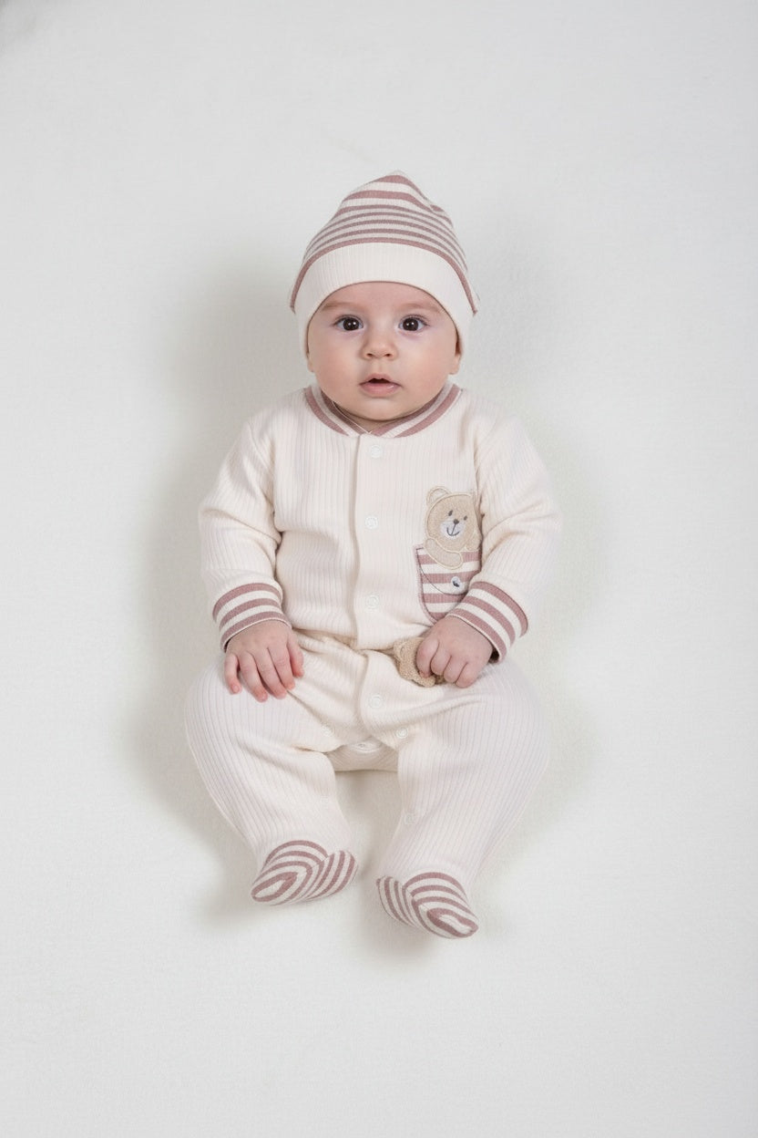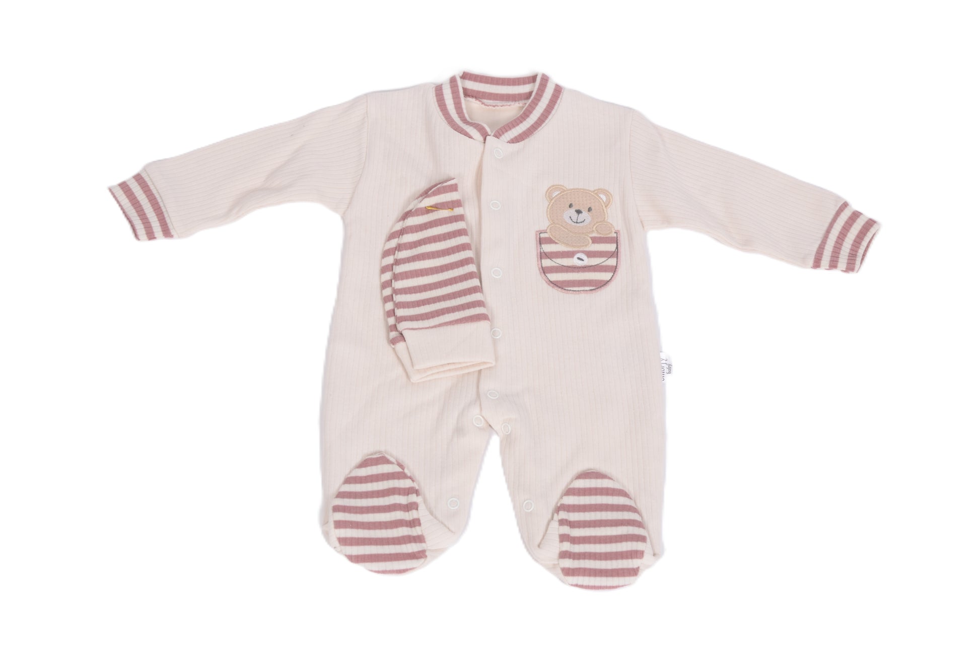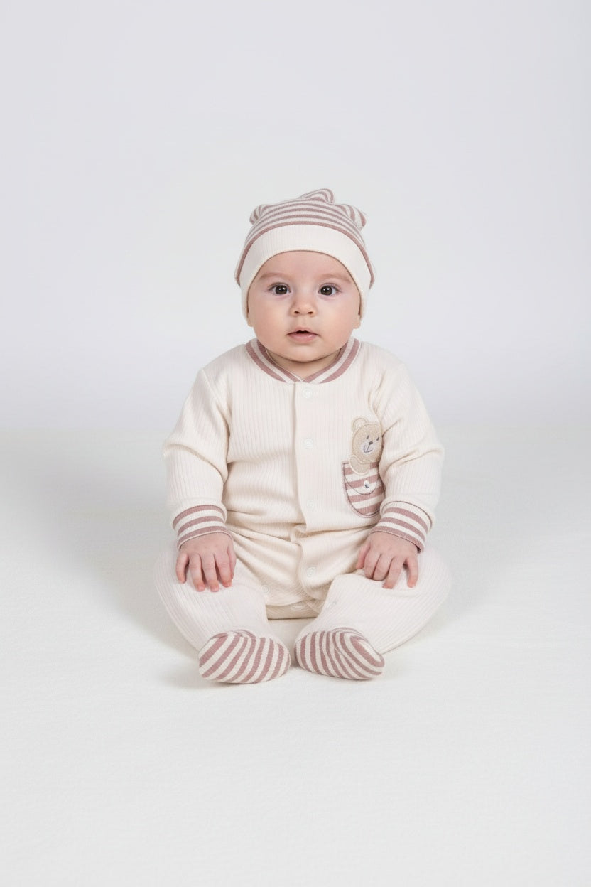 Очарователен бебешки гащеризон в нежен кремав цвят с акценти в розово-бордо райе. На гърдите има сладка апликация на мече, което „наднича“ от джобче, създавайки игрив и мил ефект. Моделът е с дълги ръкави и закрити крачета за повече топлина и удобство. Включена е и шапчица в същия десен за завършена визия.