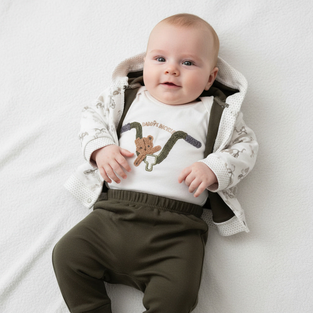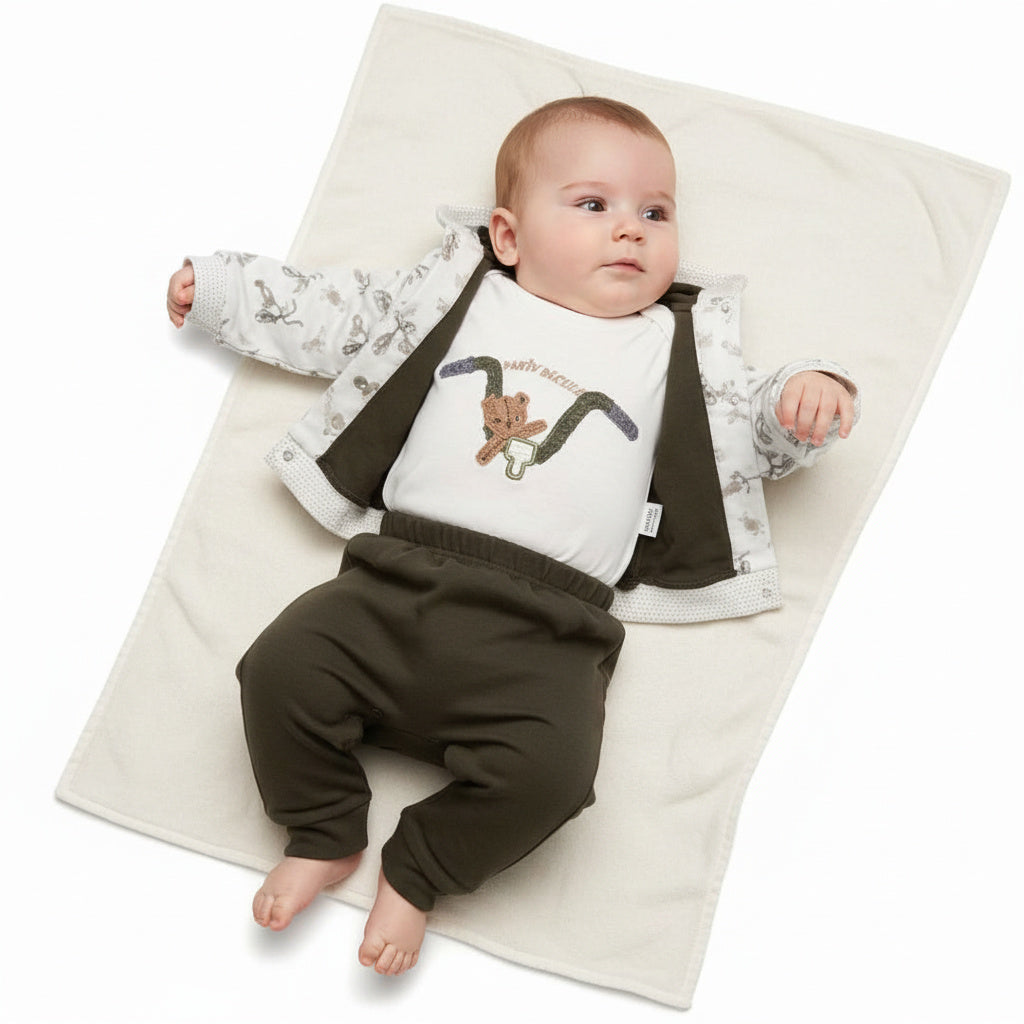 Нежен и стилен бебешки комплект, вдъхновен от природата. Меките землисти тонове, съчетани с бяло горнище с животински мотиви и сладък принт на мече, създават уютна и хармонична визия.