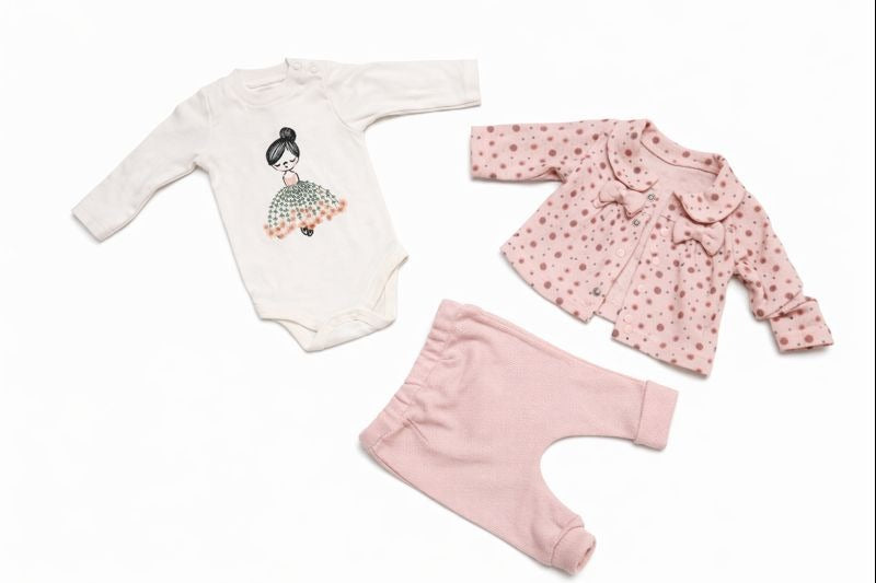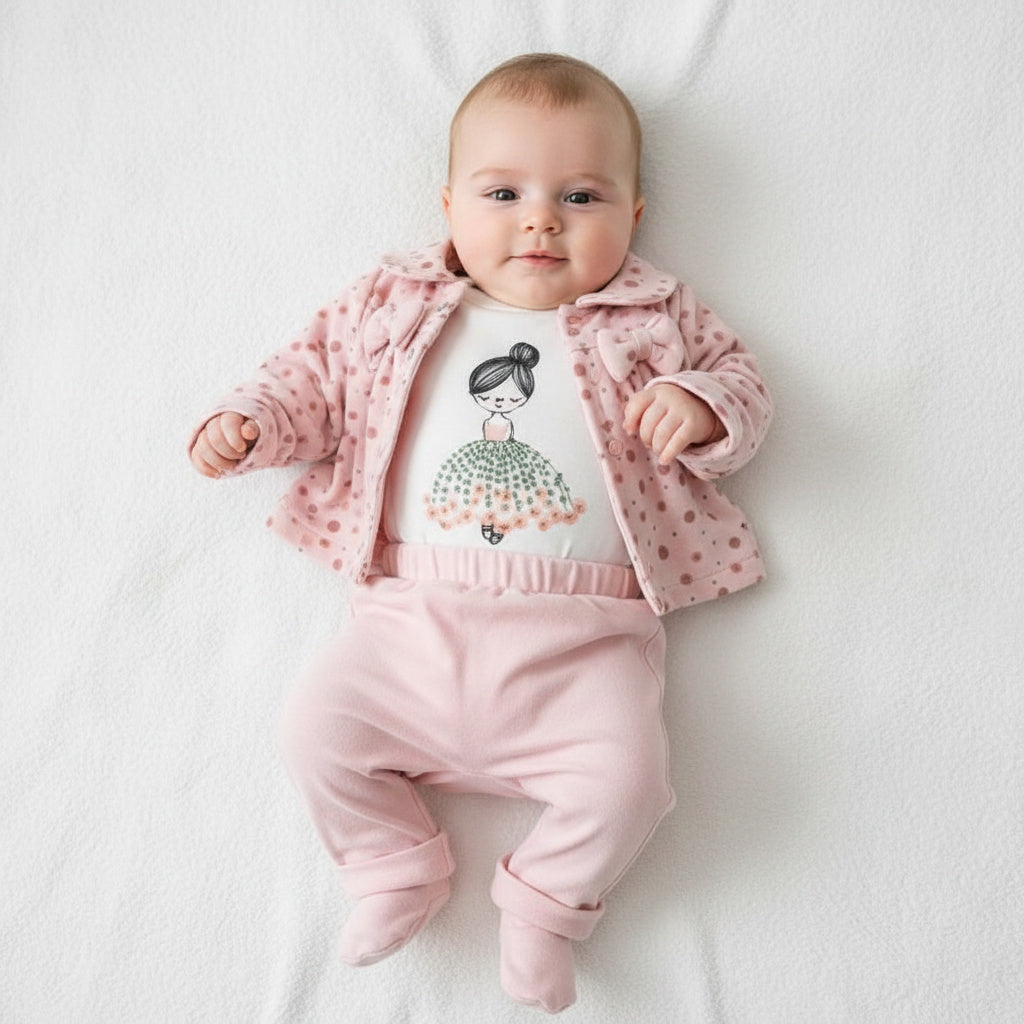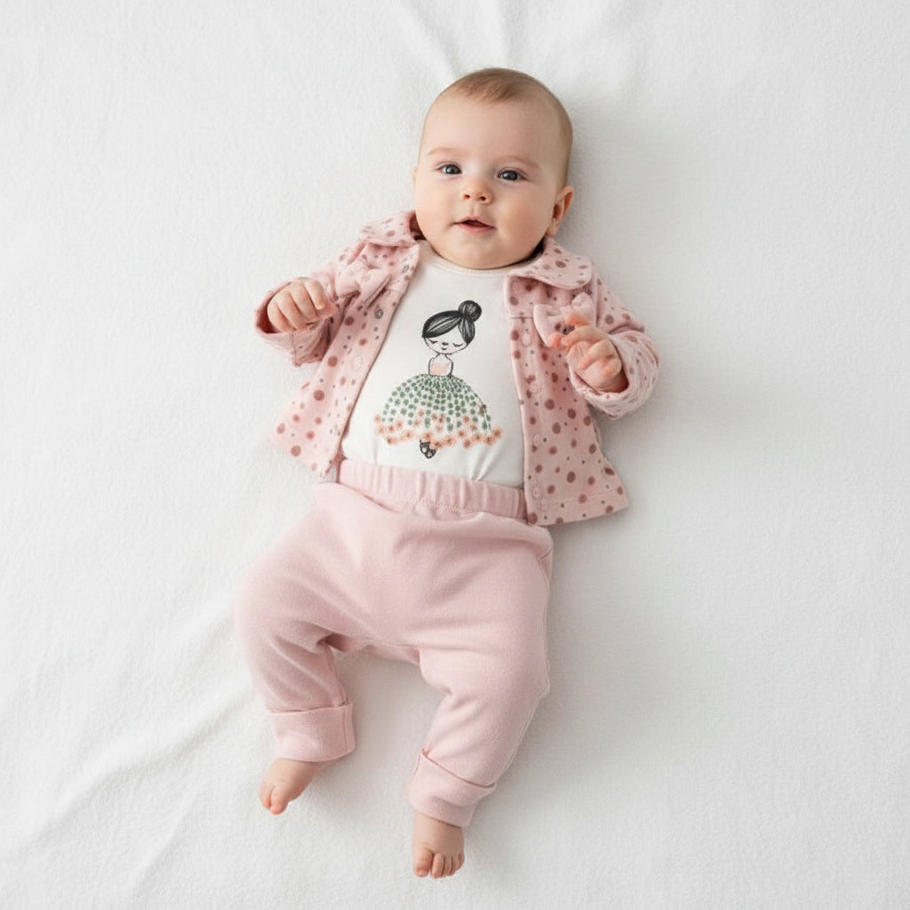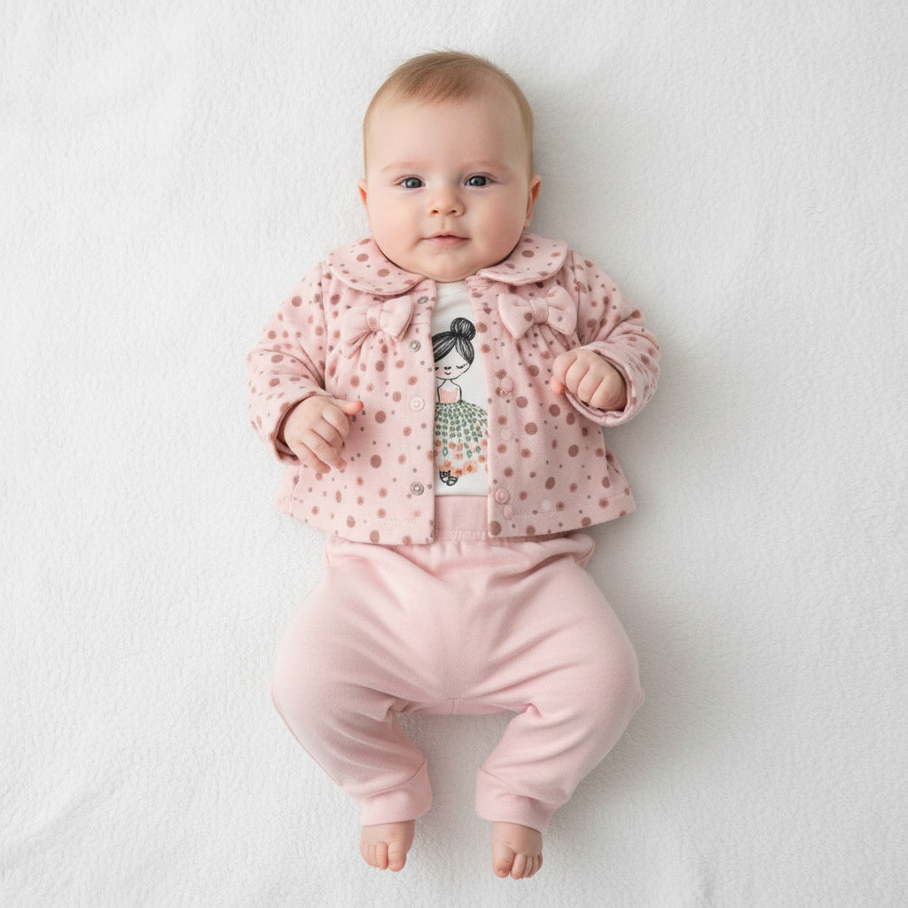 Нежен и изискан бебешки комплект, вдъхновен от света на балета. Комбинацията от меко бяло боди с момиченце балерина и розово горнище с точки и панделки създава деликатна, сладка и хармонична визия.