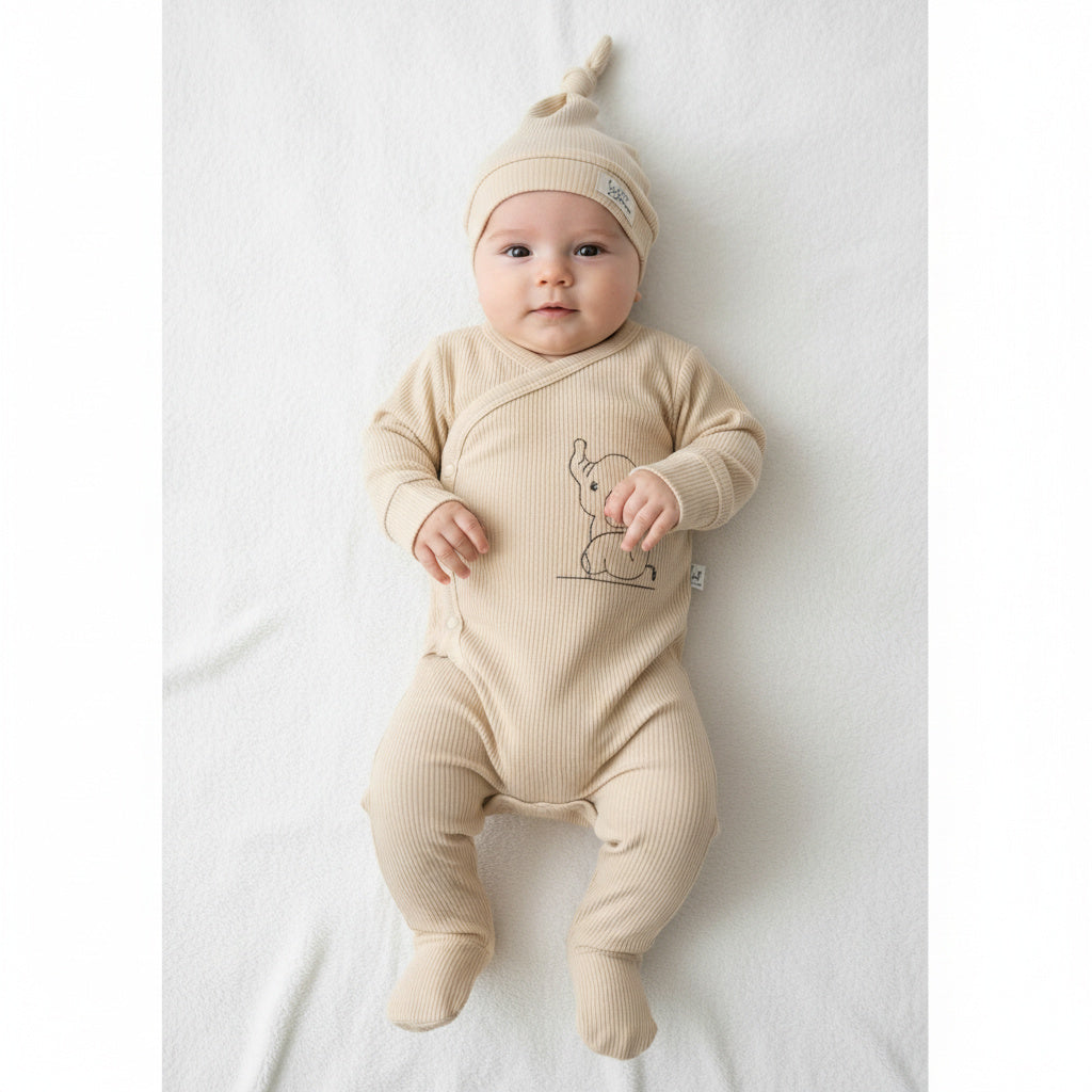 Нежен и мек бебешки комплект в топъл кремав нюанс, създаден с внимание към комфорта на най-малките. Сладкото слонче отпред придава мил и уютен характер на визията.