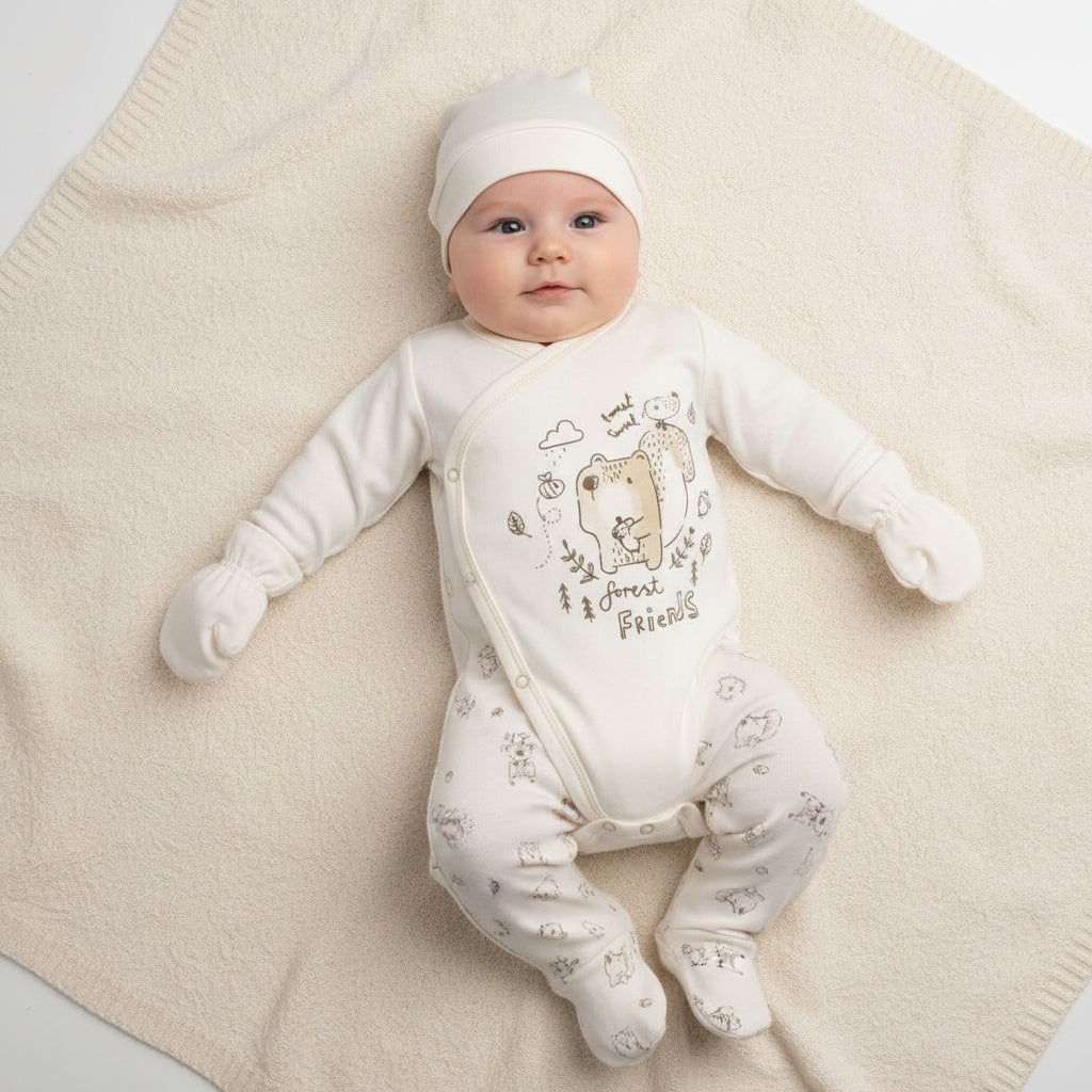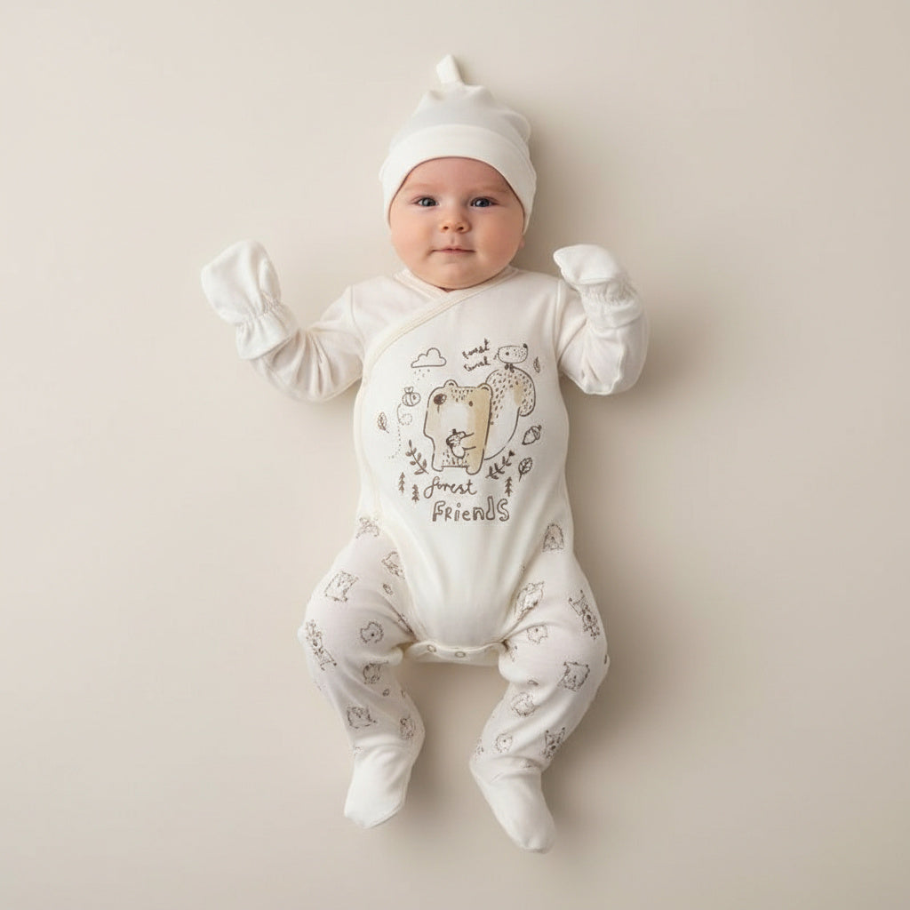 Нежен и хармоничен бебешки комплект в изчистен бял цвят, вдъхновен от горските приятели. Деликатните принтове с катерички придават уютно и естествено излъчване, подходящо за първите дни на новороденото.