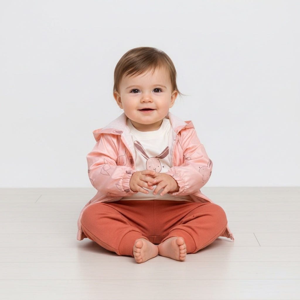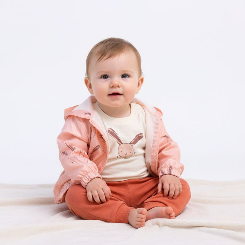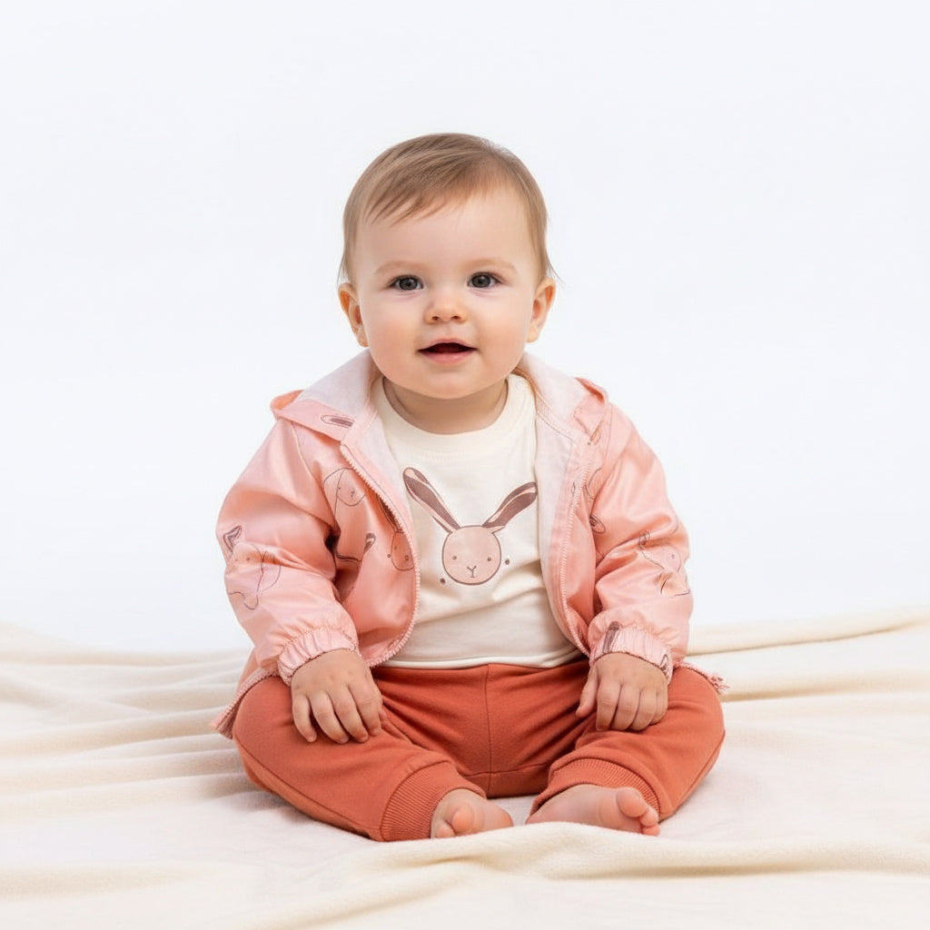 Нежен, свеж и изключително кокетен комплект за малки принцеси. „Pink Bunny Adventure“ съчетава мекотата на памука с практична ветровка, подготвяйки вашето дете за всяка разходка на открито.