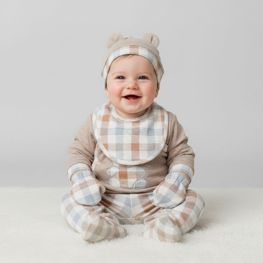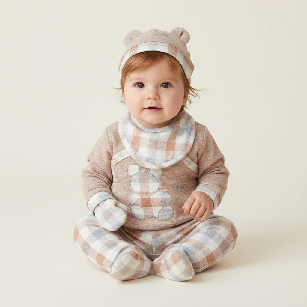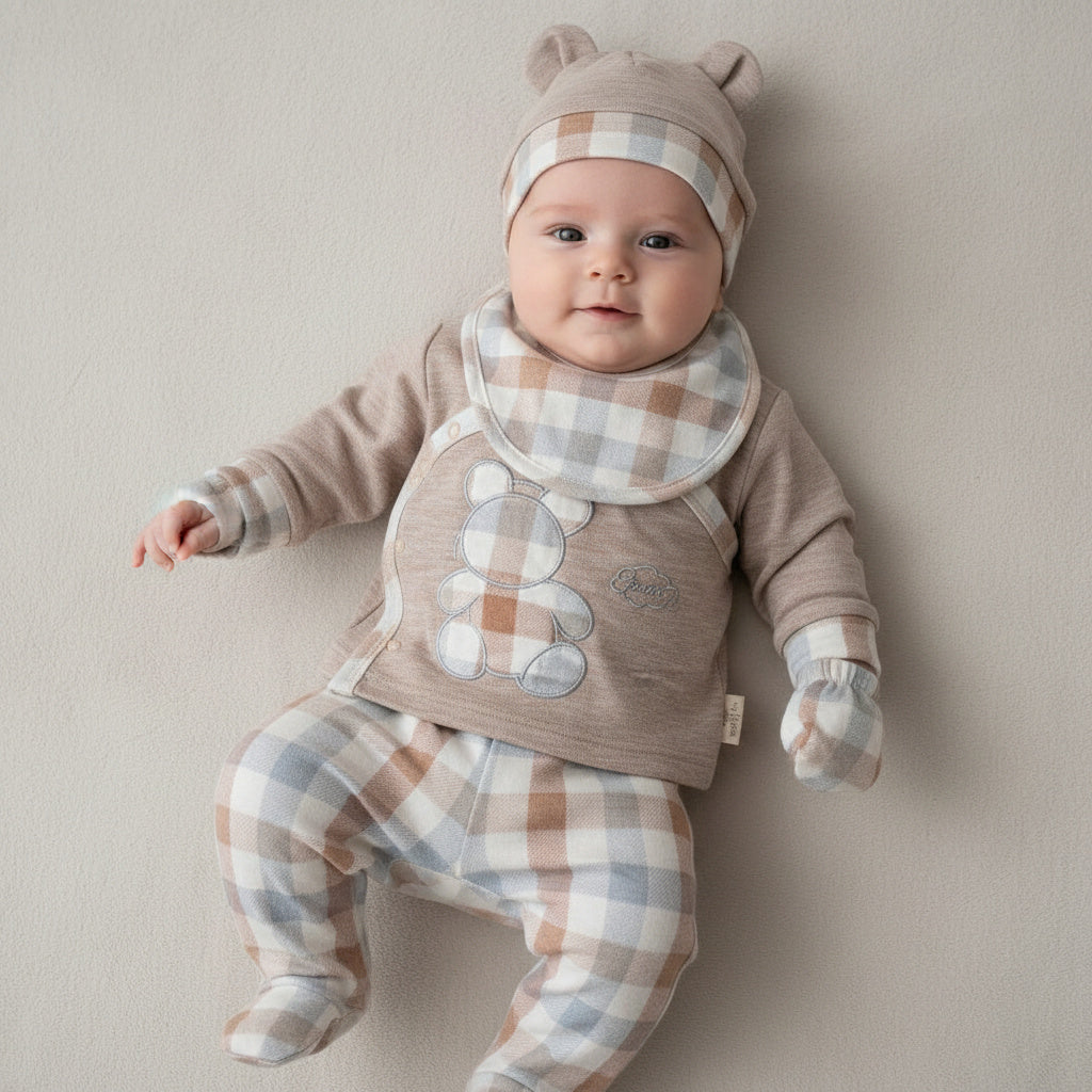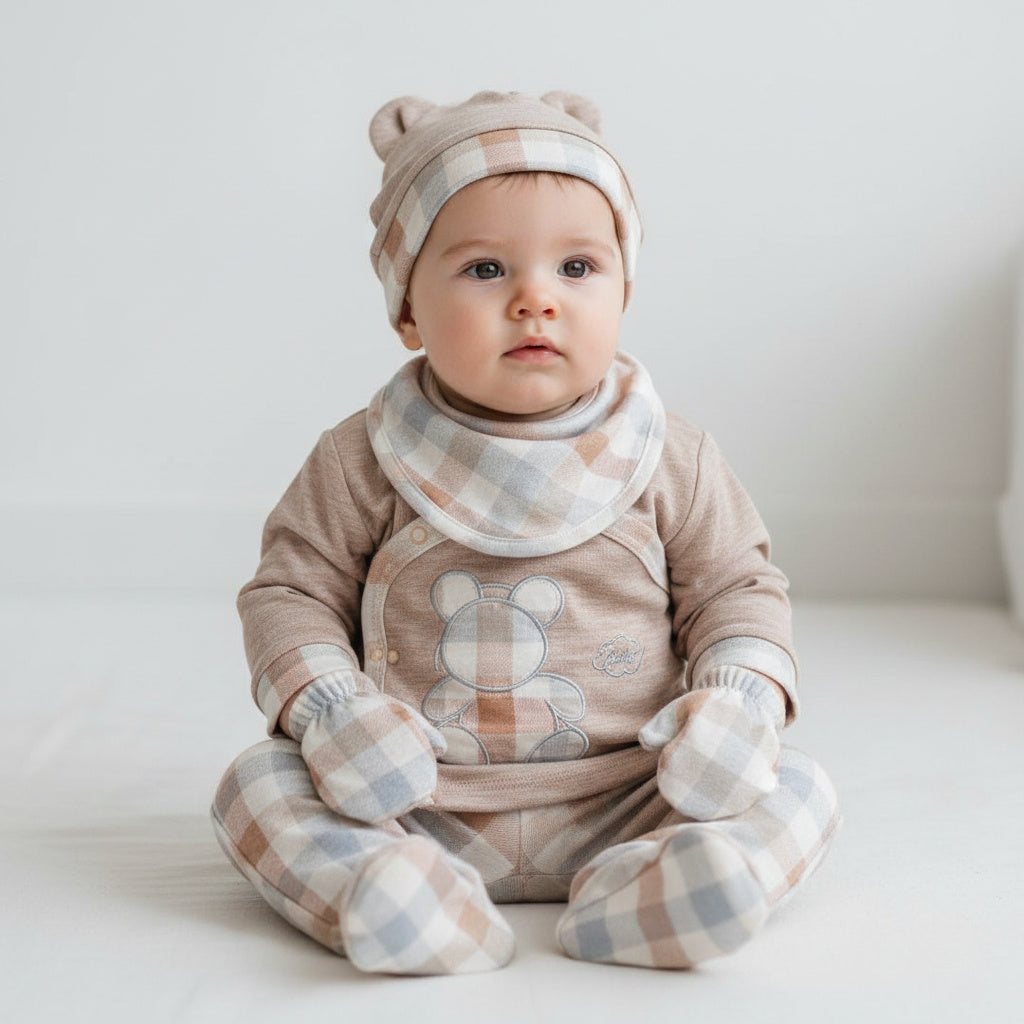 Елегантен, уютен и изключително нежен – комплектът „Cozy Bear“ е създаден за първите специални дни на вашето бебе. Комбинацията от топли бежови тонове, класическо каре и сладка апликация с мече придава стилна и спокойна визия.