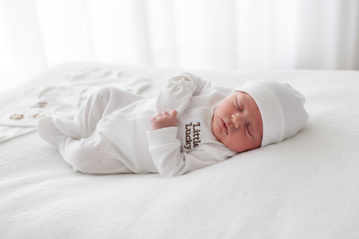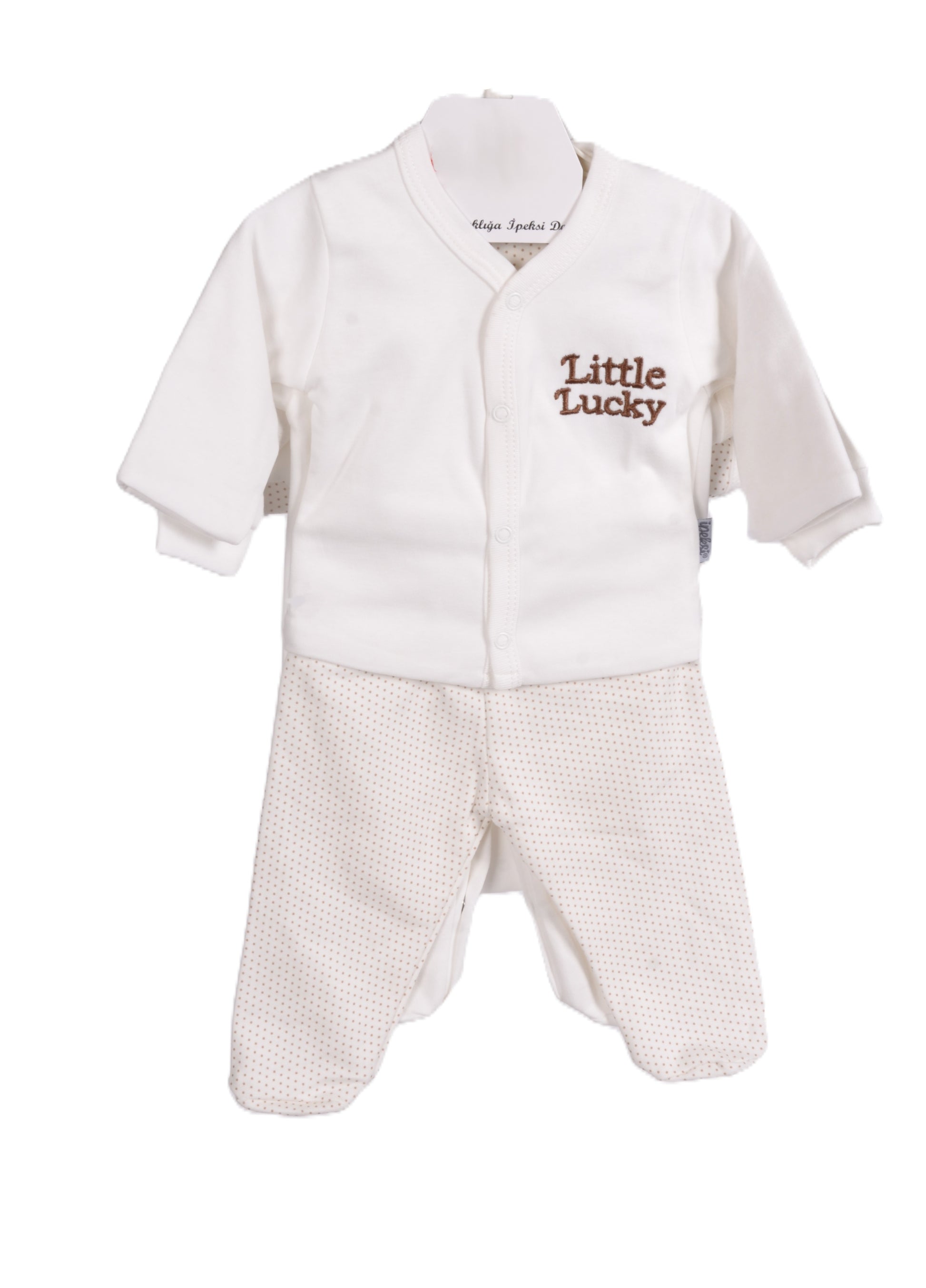 Нежен и уютен комплект за новородено “Little Lucky”, изработен от мек и дишащ 100% памук, създаден с грижа за чувствителната кожа на бебето. В класически бял цвят с деликатна бродерия на зайче и надпис Little Lucky, този комплект е перфектен избор за първите дни у дома или за изписване от родилния дом.