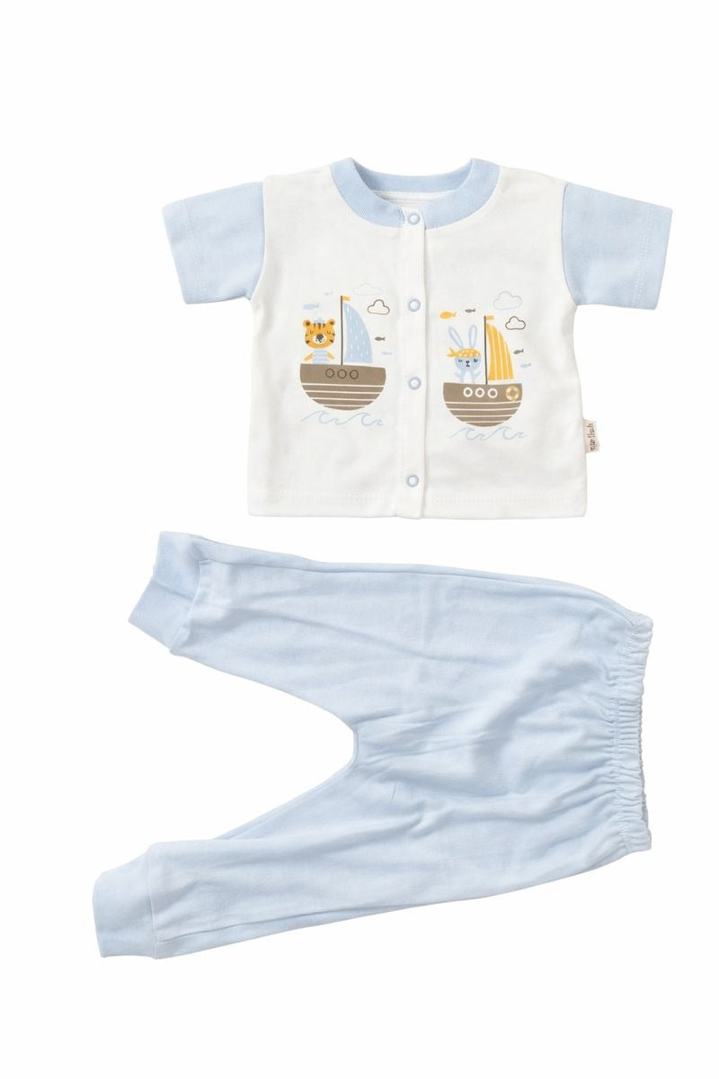 • Блузка с къс ръкав в бяло със светлосини ръкави, украсена с весели морски апликации – лодки и животинки. Закопчаване с копчета отпред за лесно обличане.