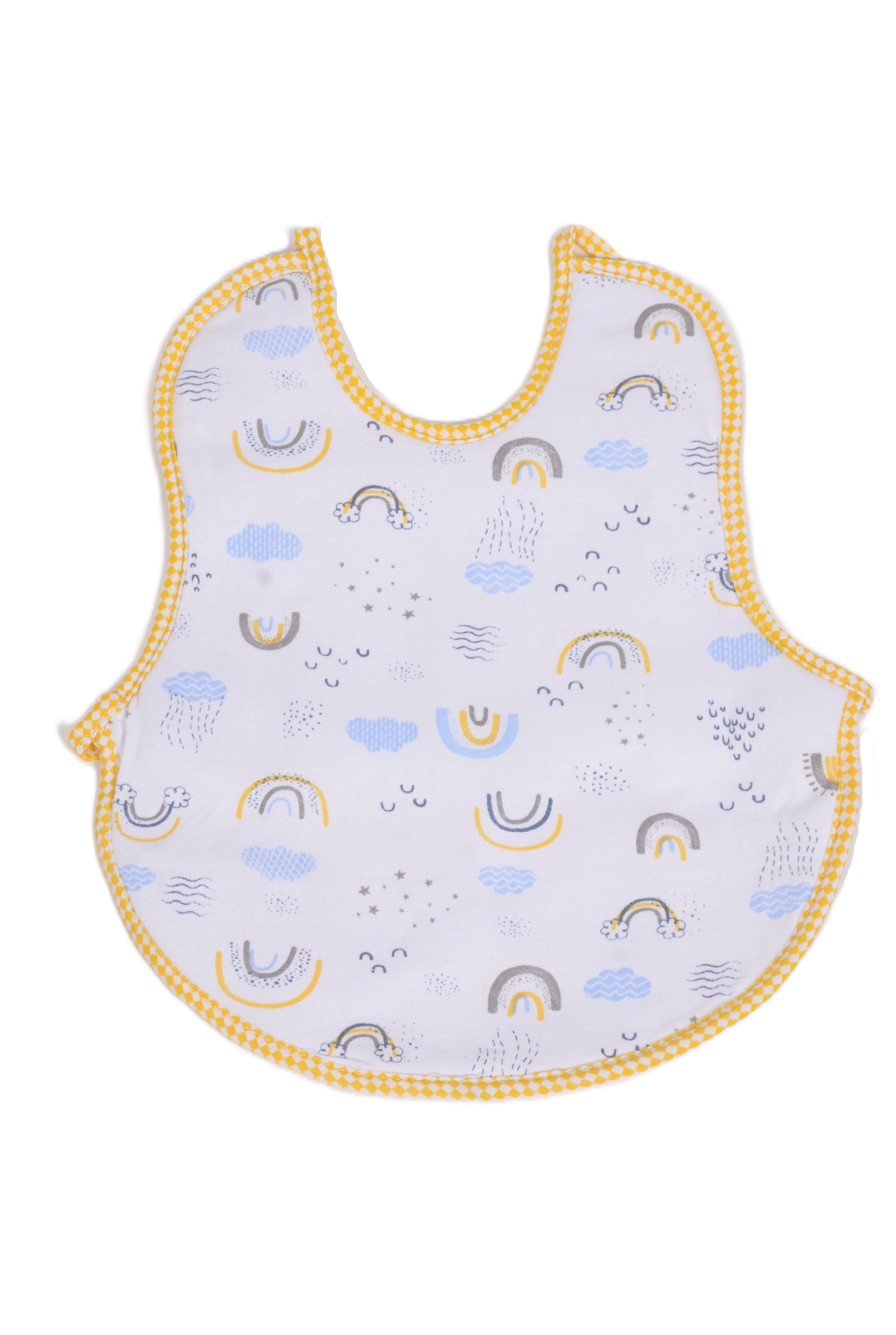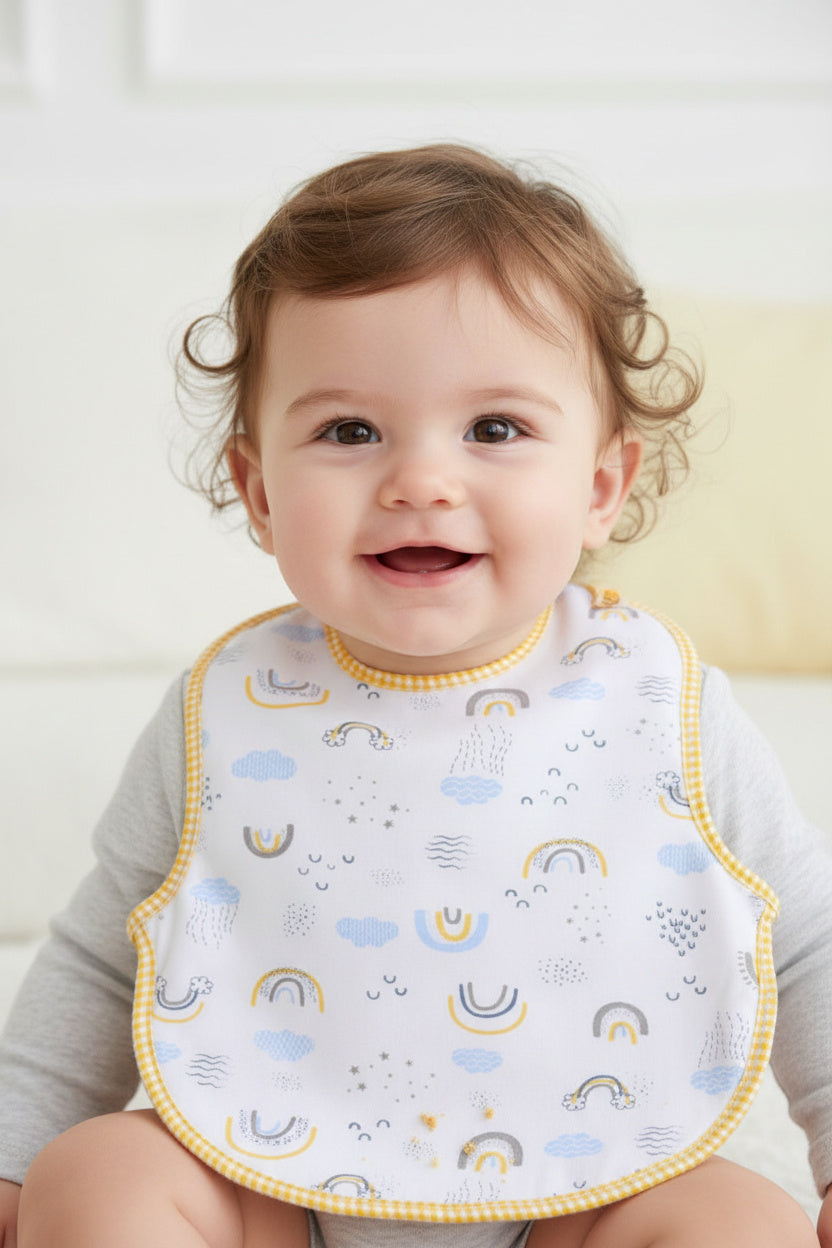 Очарователен и мек бебешки лигавник, изработен от 100% памук, който осигурява комфорт и защита по време на хранене. Белият фон е украсен с нежни рисунки на дъги, облачета и звездички в пастелни тонове на синьо, сиво и жълто, а кантовете са в красиво жълто каре – за свеж и слънчев акцент.