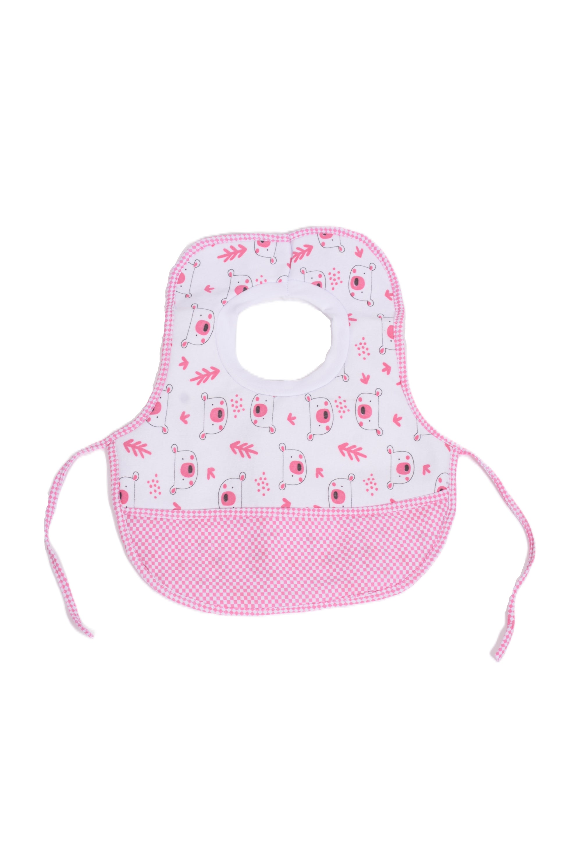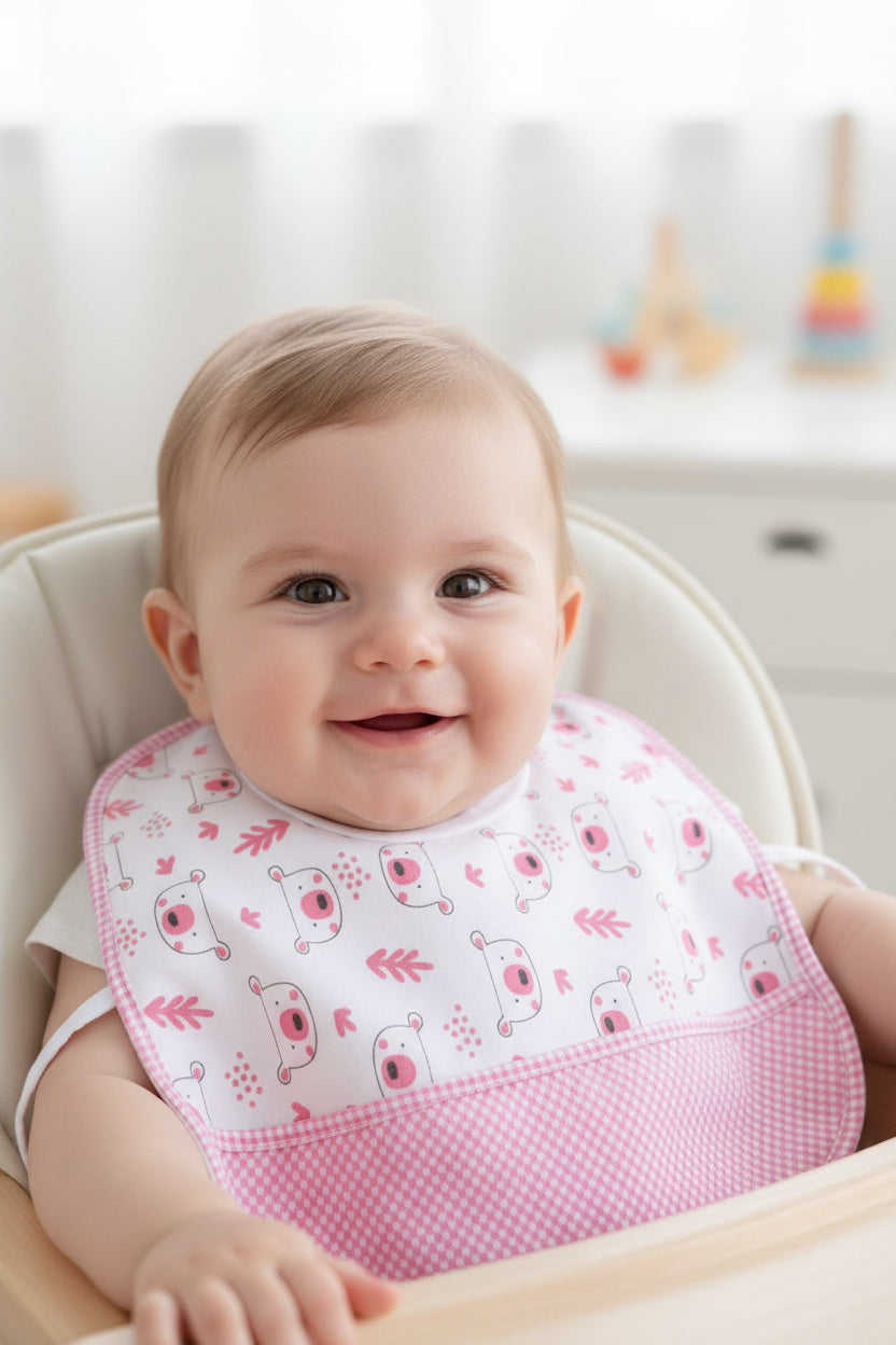 Практичен и сладък бебешки лигавник, изработен от мек и удобен памук, който осигурява защита по време на хранене. Дизайнът е в нежно розово-бяло съчетание с весели мечета и долна част в розово каре – перфектен аксесоар за всяко малко момиченце.