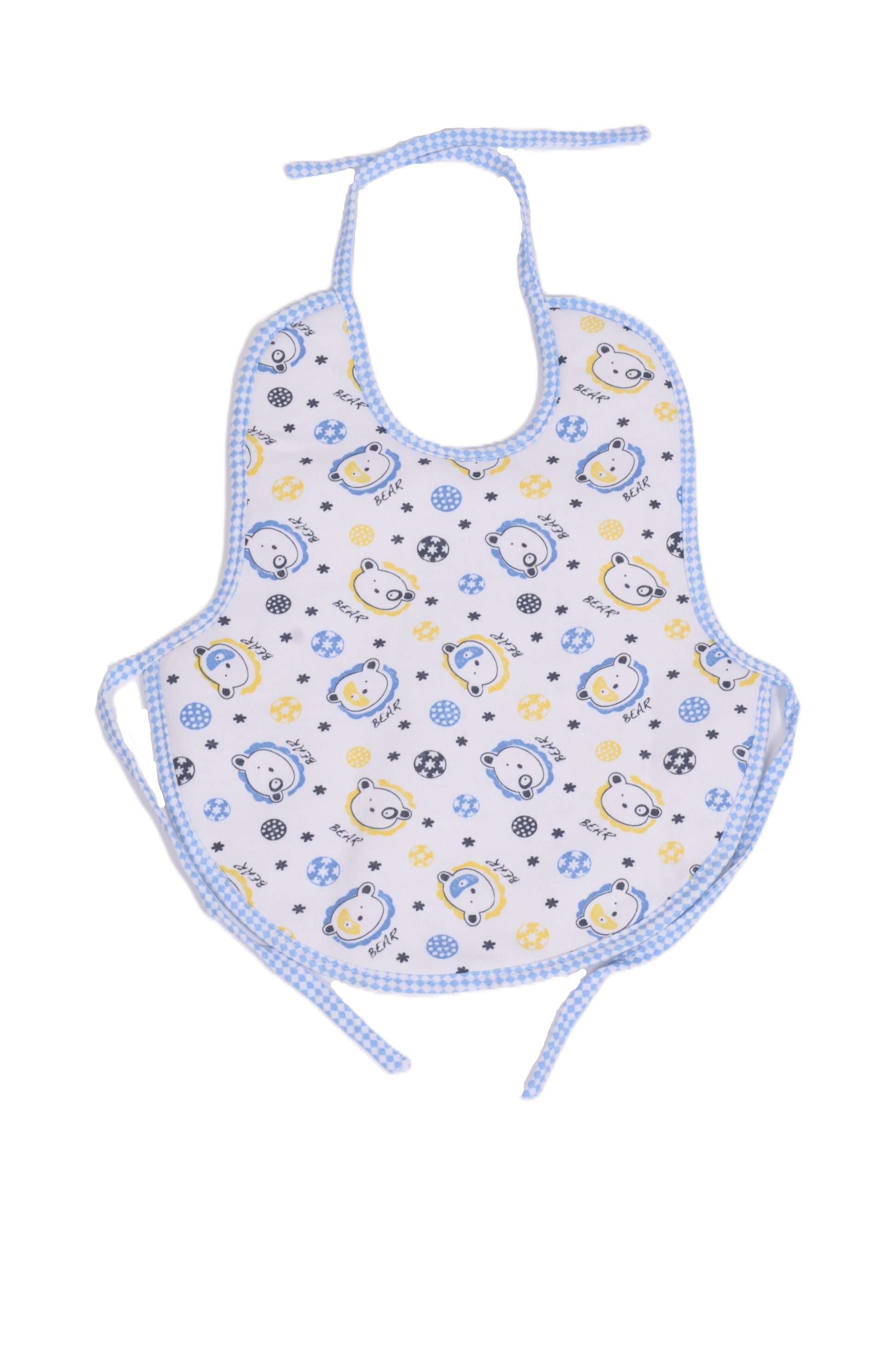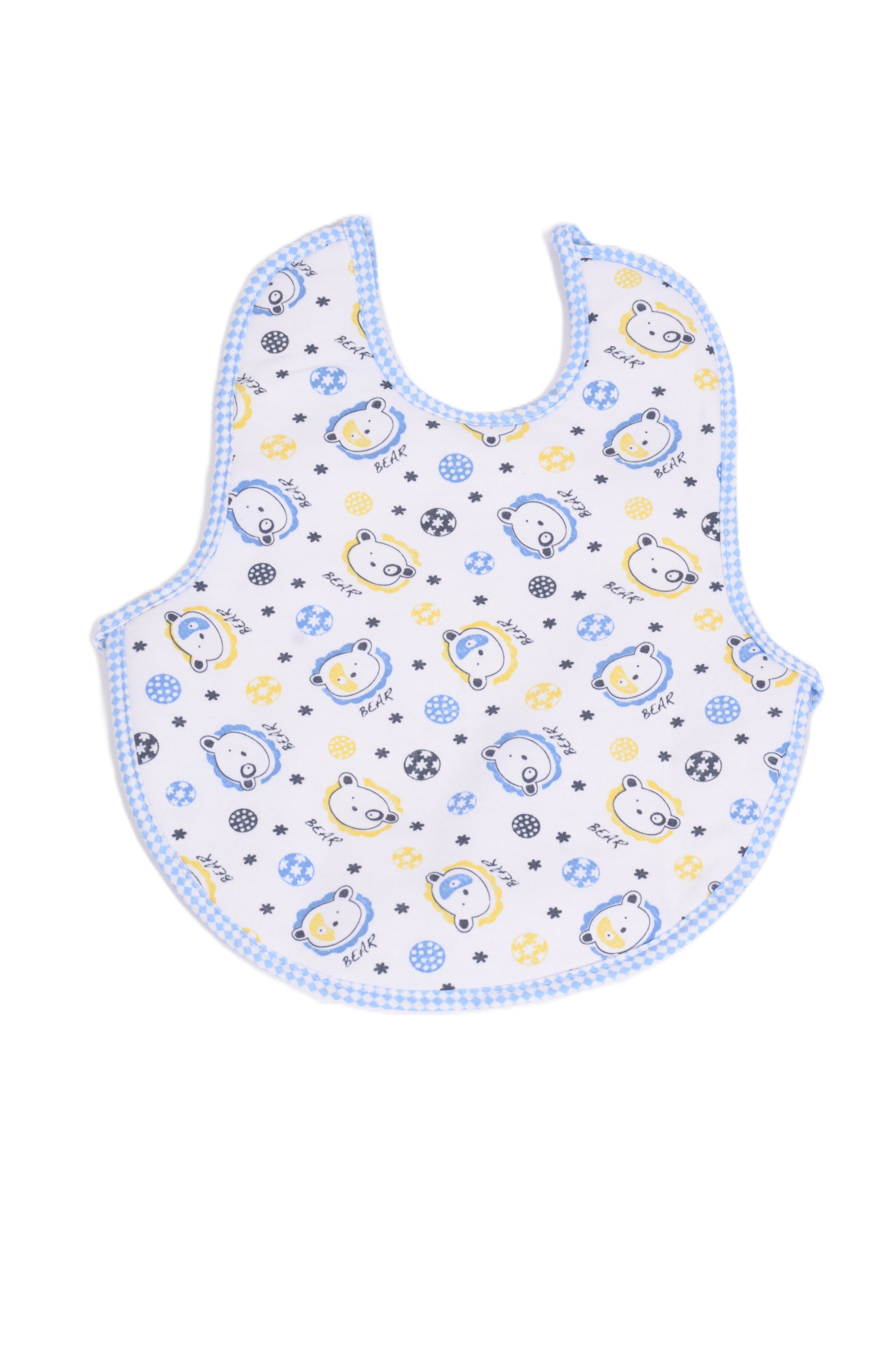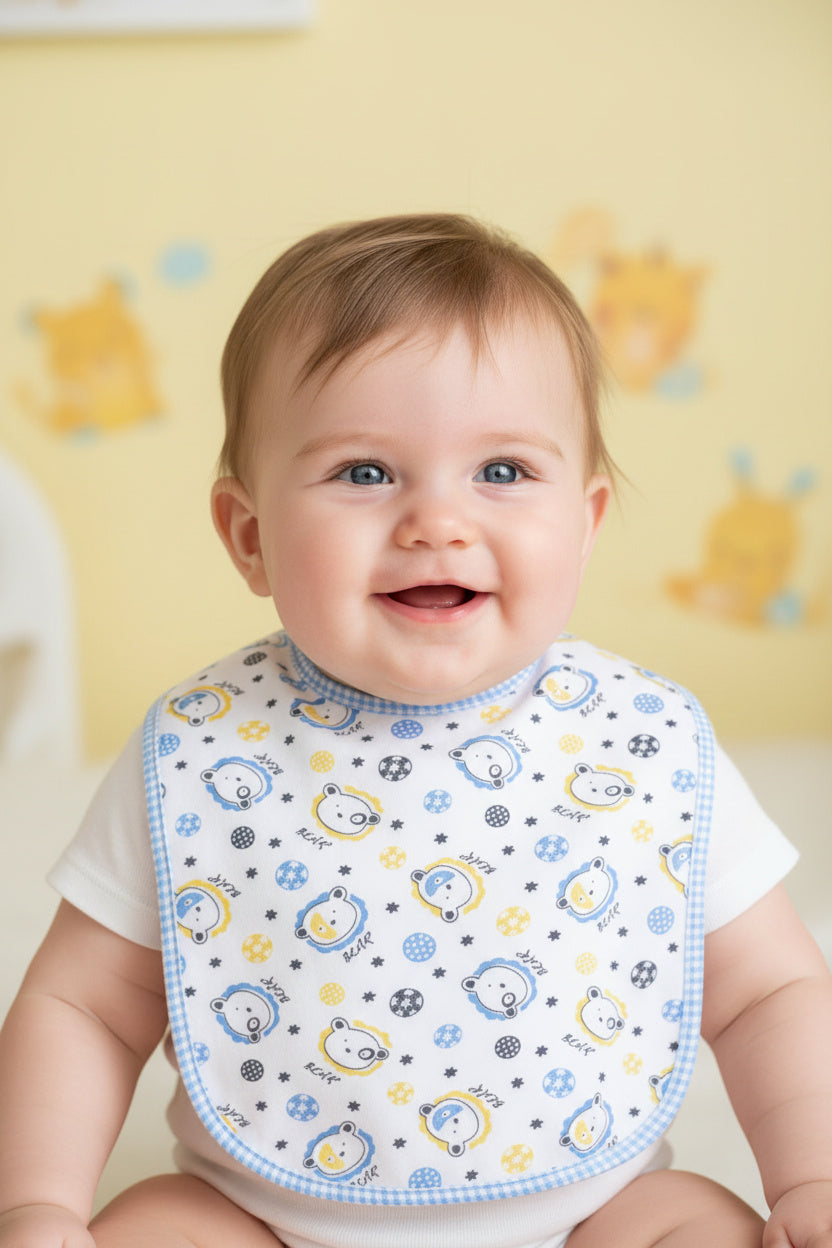 Очарователен и удобен бебешки лигавник, изработен от мек и нежен памук, който осигурява комфорт и защита по време на хранене. Белият фон е украсен с весели мечета, звездички и топчета в нюанси на синьо, жълто и сиво – чудесен избор за малки момченца.