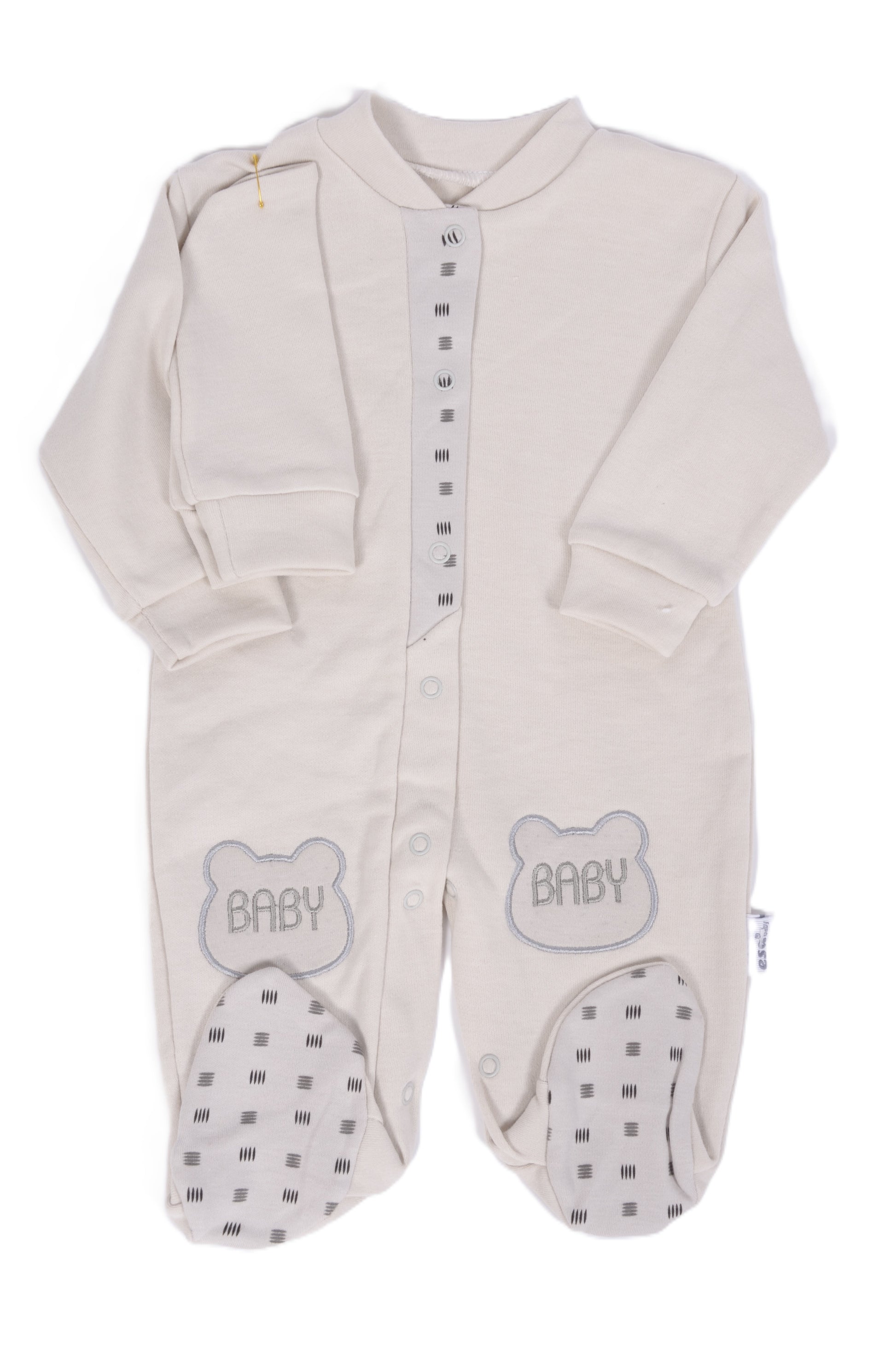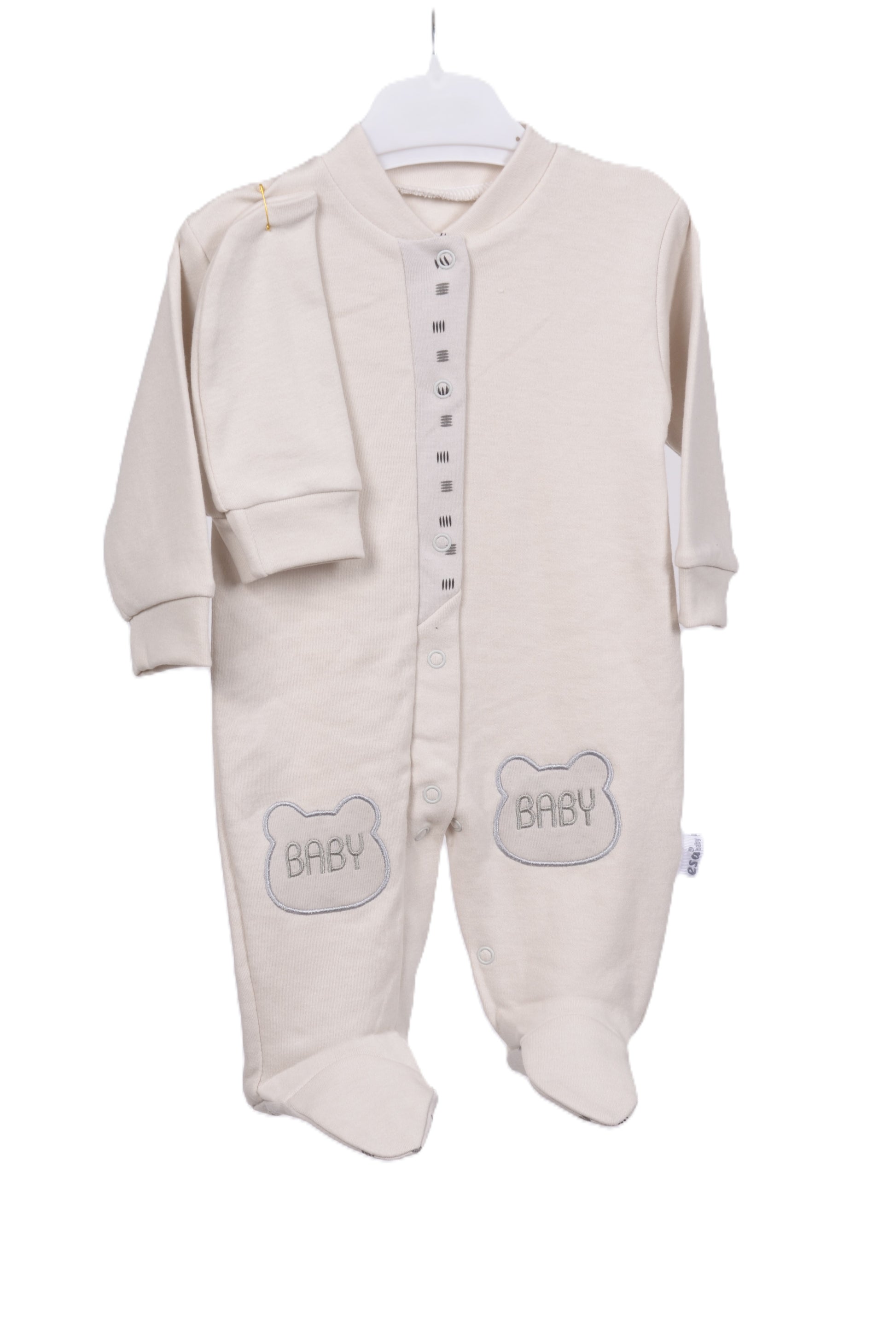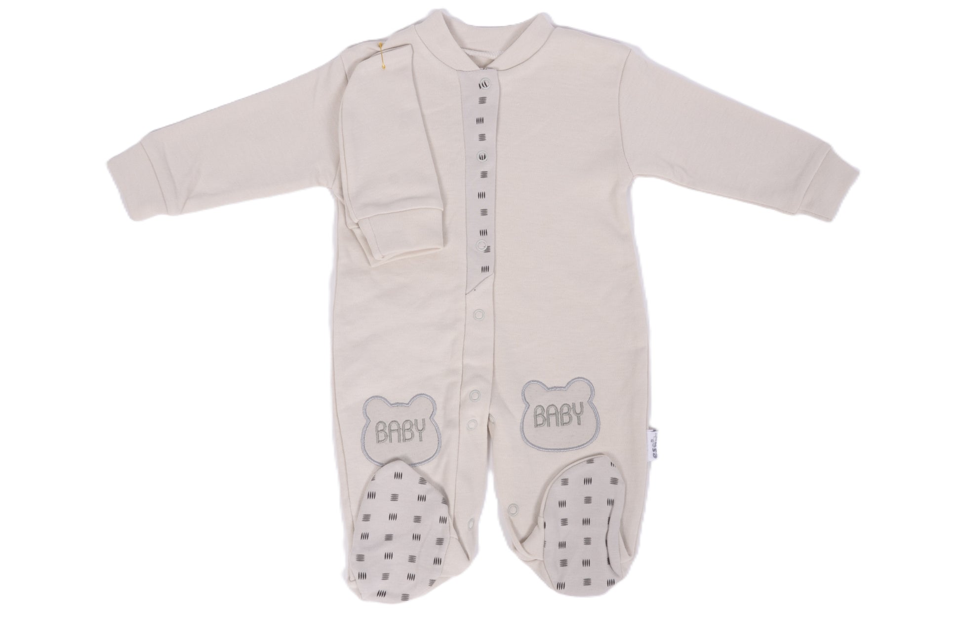 Нежен и удобен комплект, включващ ританки с дълъг ръкав и шапчица в цвят екрю. Дизайнът е изчистен и стилен, с бродерия „Baby“ във форма на мече и декорация на ходилата. Изработен от мек памук, който осигурява комфорт и топлина през целия ден. Практичното закопчаване с тик-так копчета отпред прави обличането лесно и бързо.