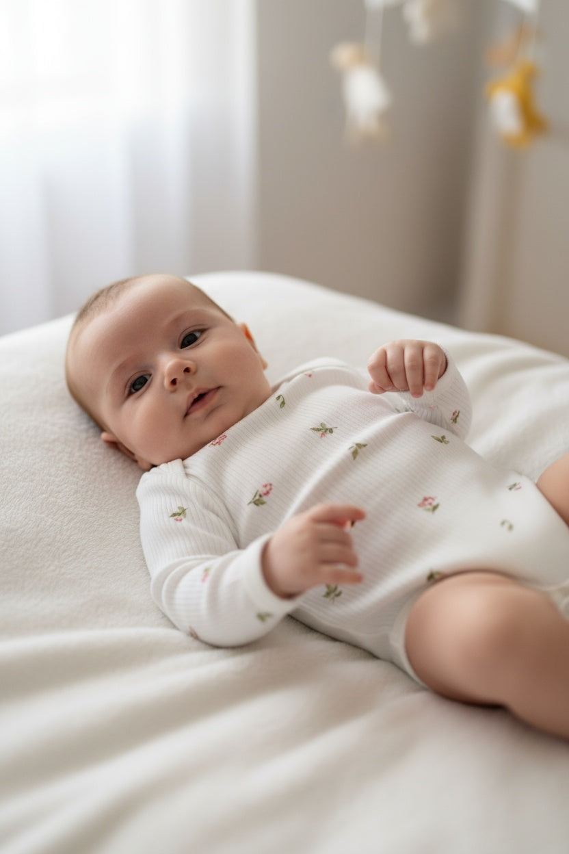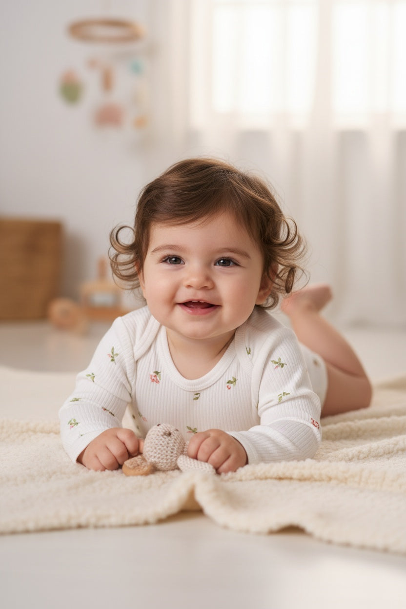 Нежно и стилно боди, изработено от меко памучно рипсено трико. Декорирано е с деликатни малки цветчета в розово и зелено, които придават свеж и сладък вид. Практично закопчаване с копчета в долната част за лесно обличане и преобличане.