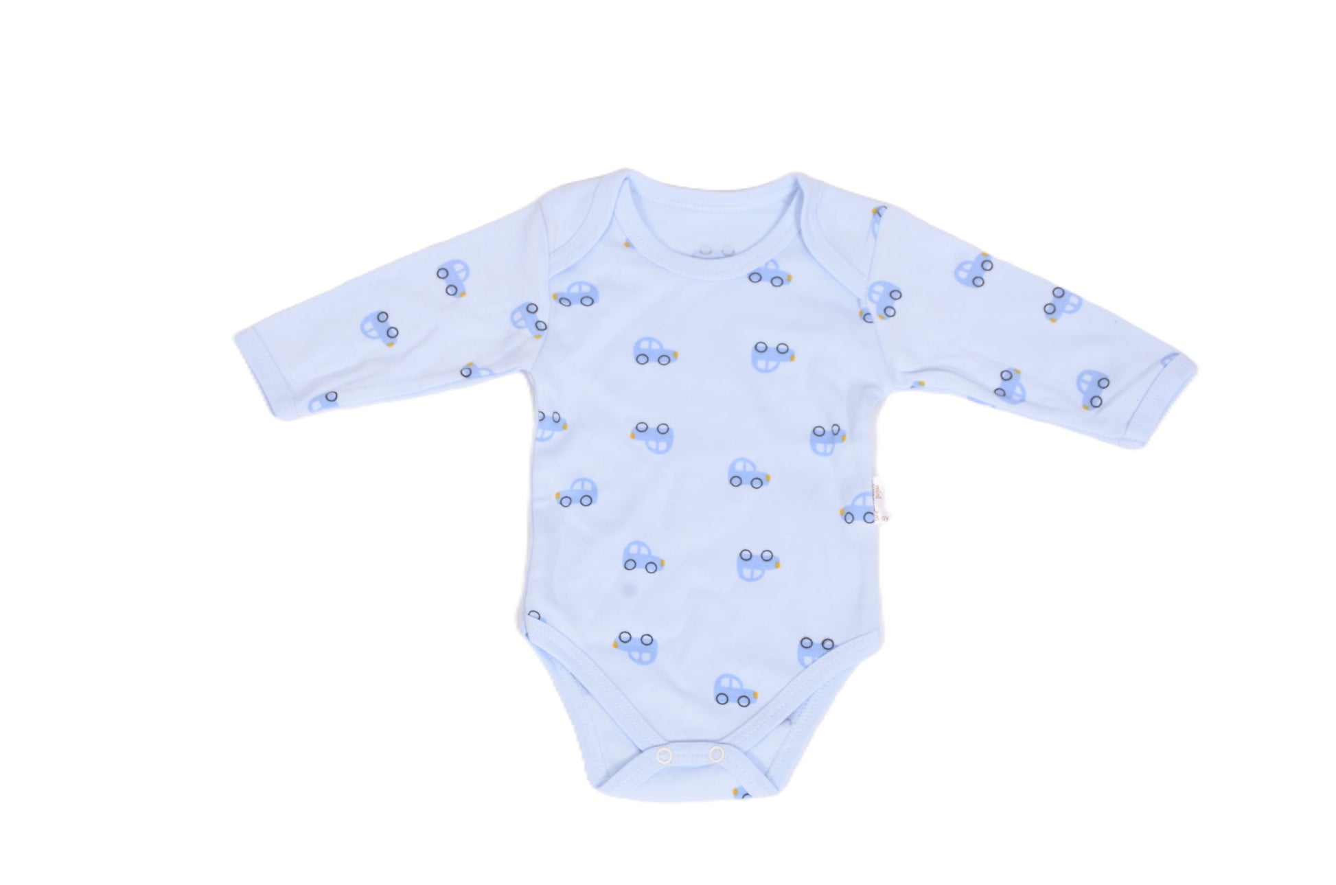Очарователно боди в светлосин цвят, украсено с весели малки колички. Изработено от мек и дишащ памук, то е подходящо за ежедневна употреба и гарантира удобство през целия ден. Дългите ръкави осигуряват топлина, а практичните тик-так копчета в долната част правят обличането и смяната на пелени лесни и бързи.