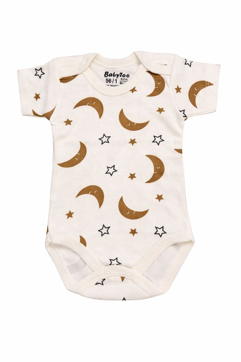 Нежно и стилно бебешко боди с къс ръкав, създадено за максимален комфорт още от първите дни. Дизайнът с луни и звездички в топли натурални тонове придава спокойна и модерна визия, подходяща както за момичета, така и за момчета.