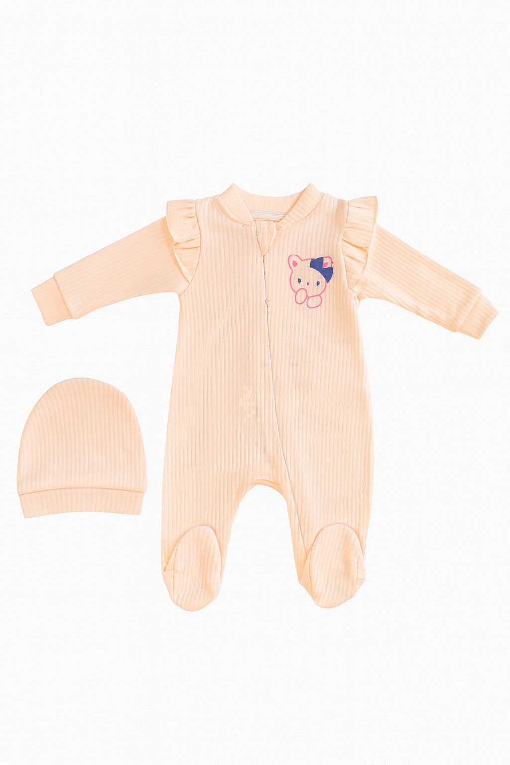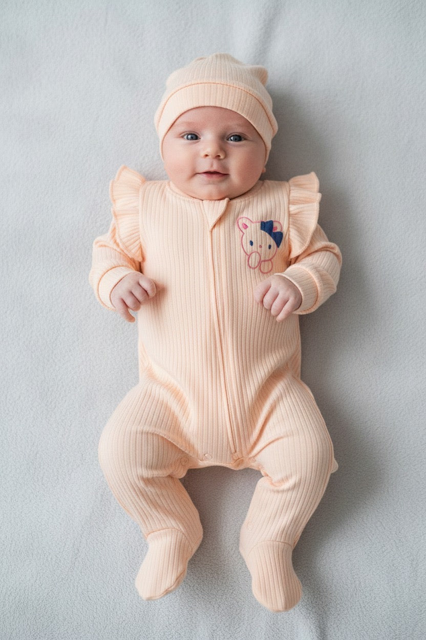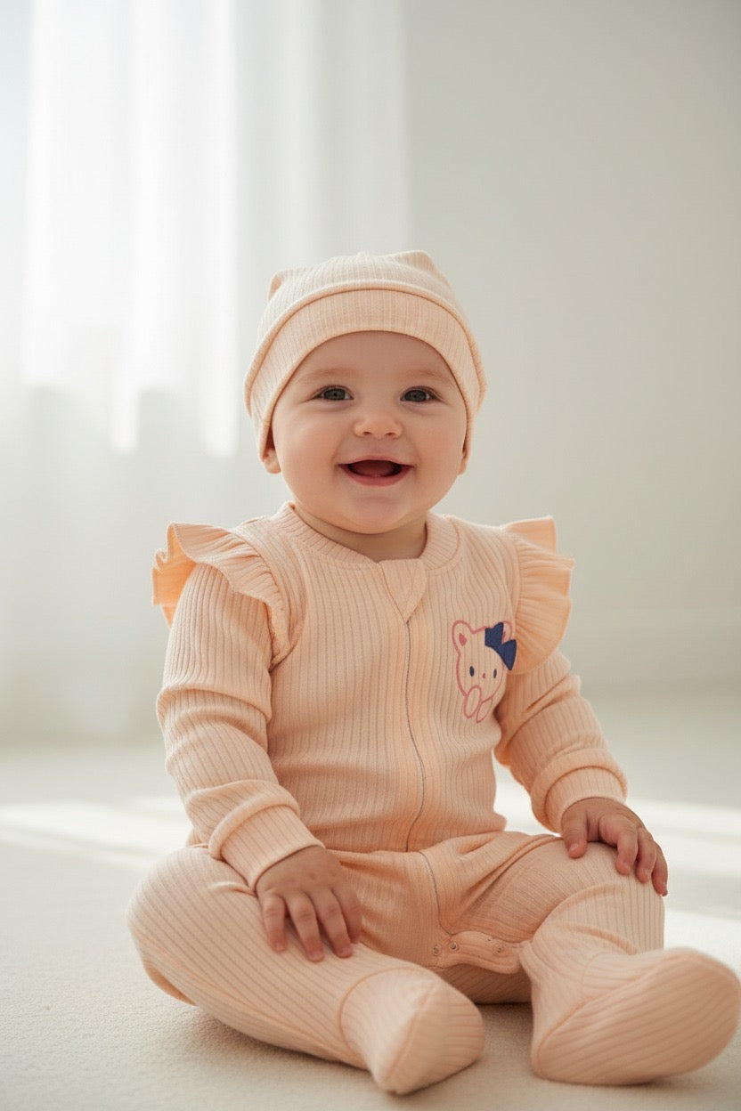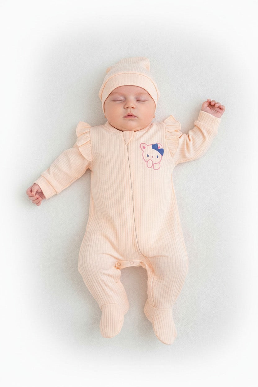 Потопете малката принцеса в уют и нежност с този очарователен прасковено-розов гащеризон с шапчица, изработен от мека рипсена материя, която гали кожата и осигурява топлинка през целия ден.