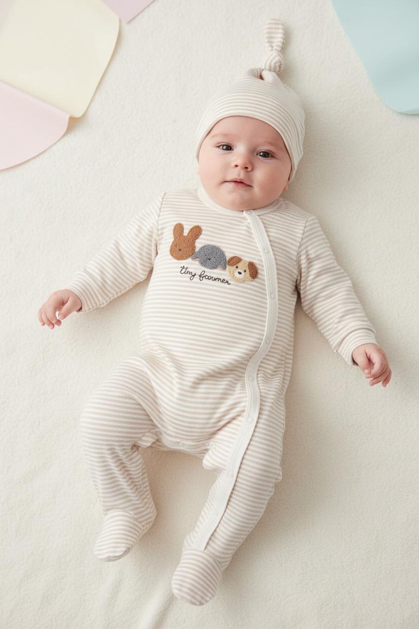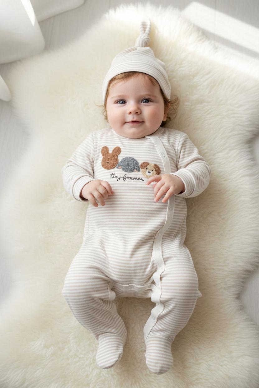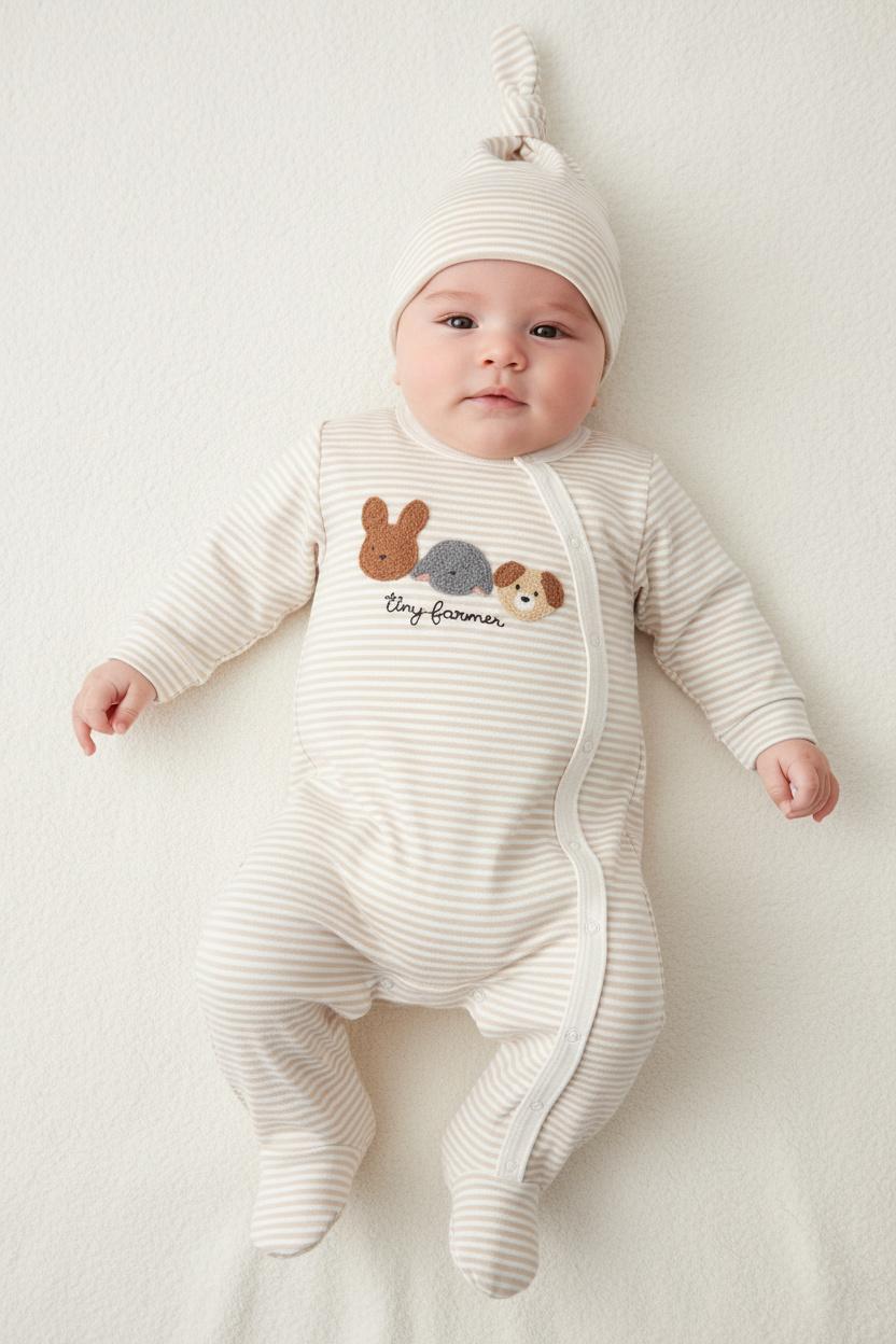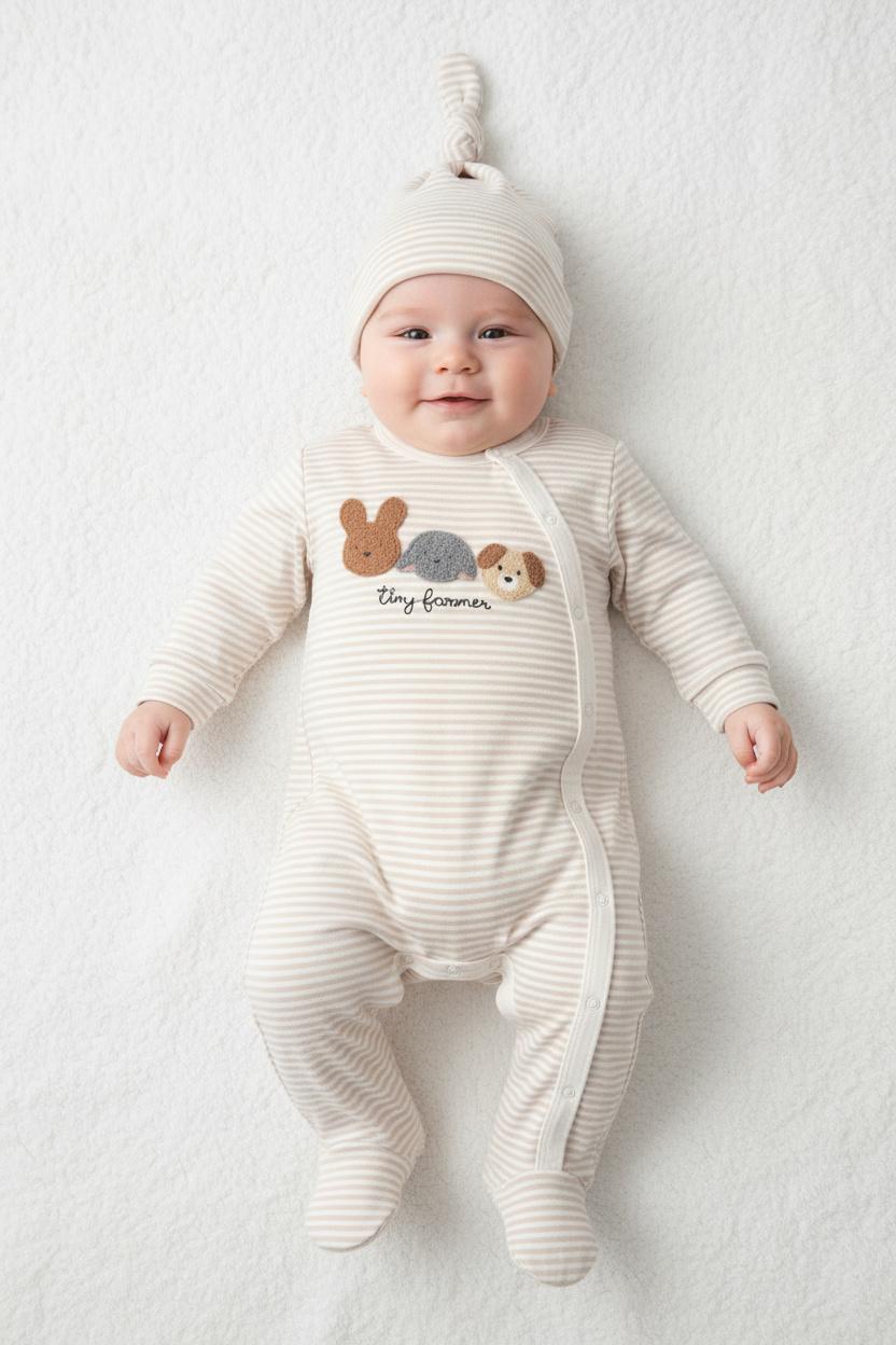 Очарователен бебешки комплект в нежни неутрални тонове, създаден за максимален комфорт и сладка визия. „Tiny Farmer“ е перфектен избор за първите дни – мек, удобен и изключително практичен за ежедневието на бебето.