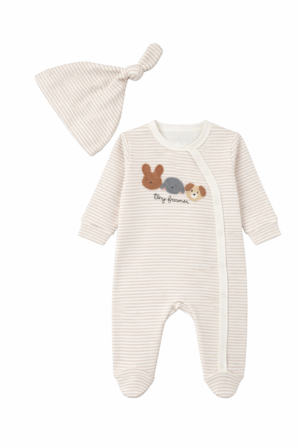 Бебешки гащеризон с шапка „Tiny Farmer“ – 2 части, бежово райе