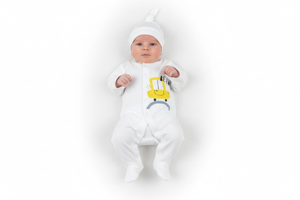 Семплият бял дизайн е освежен от сладка жълта количка и надпис “BEEP“, които добавят забавен акцент към визията. Практичните копчета по цялата дължина улесняват обличането и преобличането.