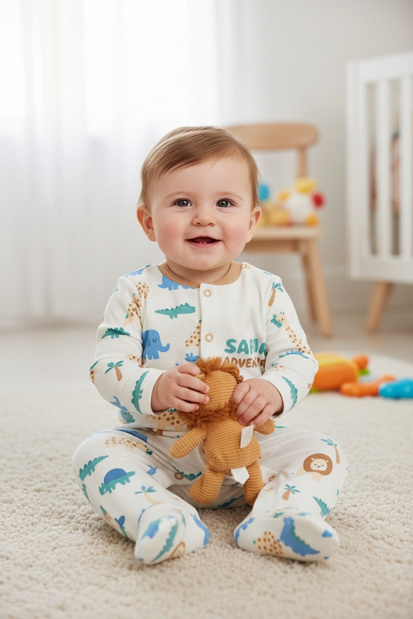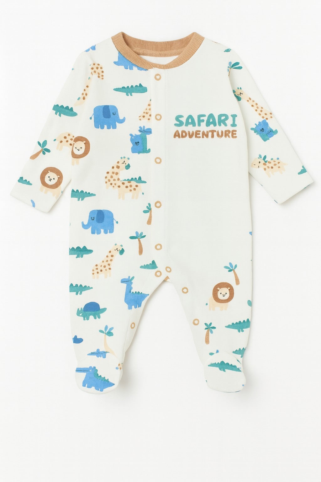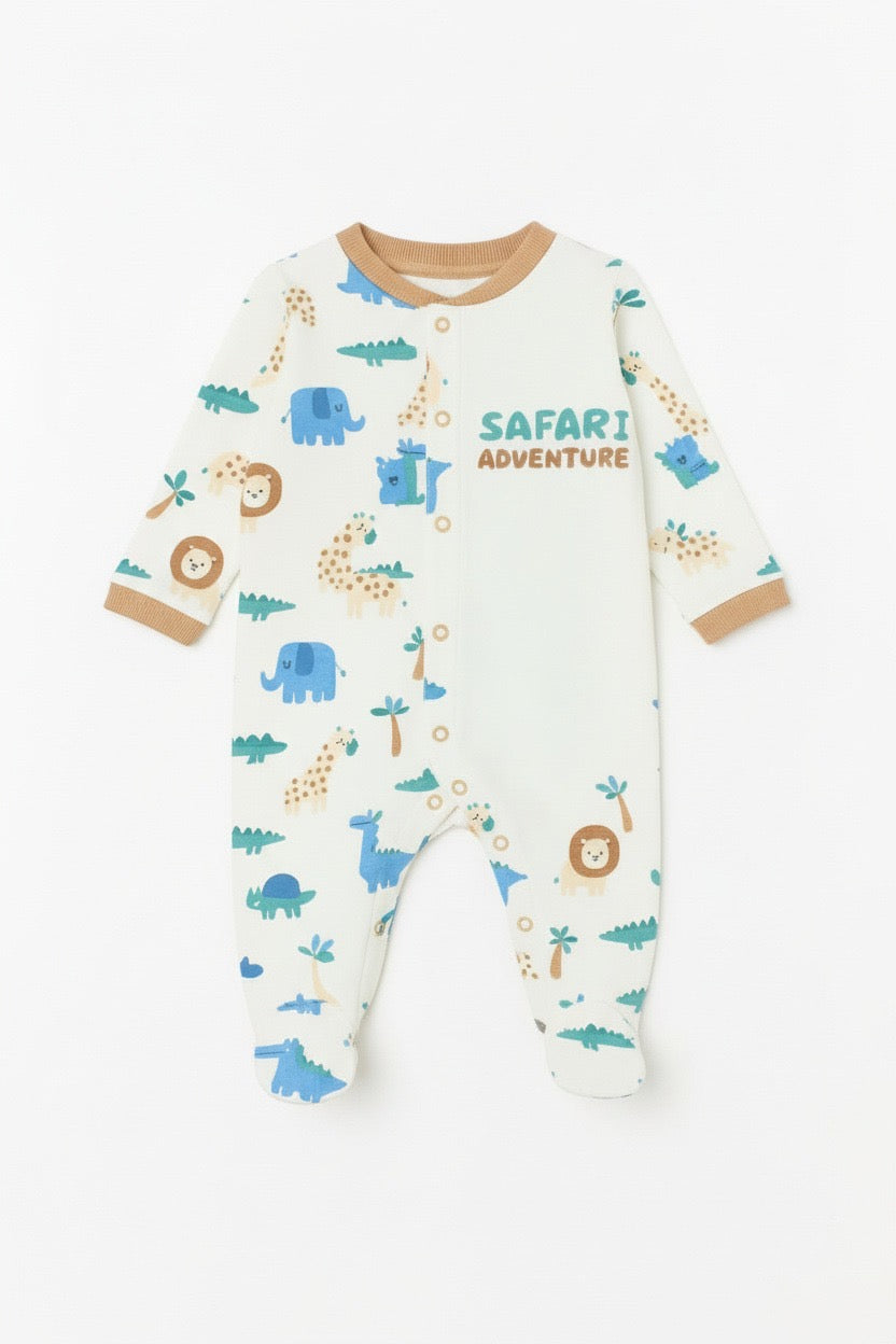Потопете вашето мъниче в свят на забавни животинки с този очарователен гащеризон „Мини  Сафари“. Покрит с весели слончета, жирафчета, лъвчета и крокодилчета, той превръща всяка разходка и игра в истинско приключение!