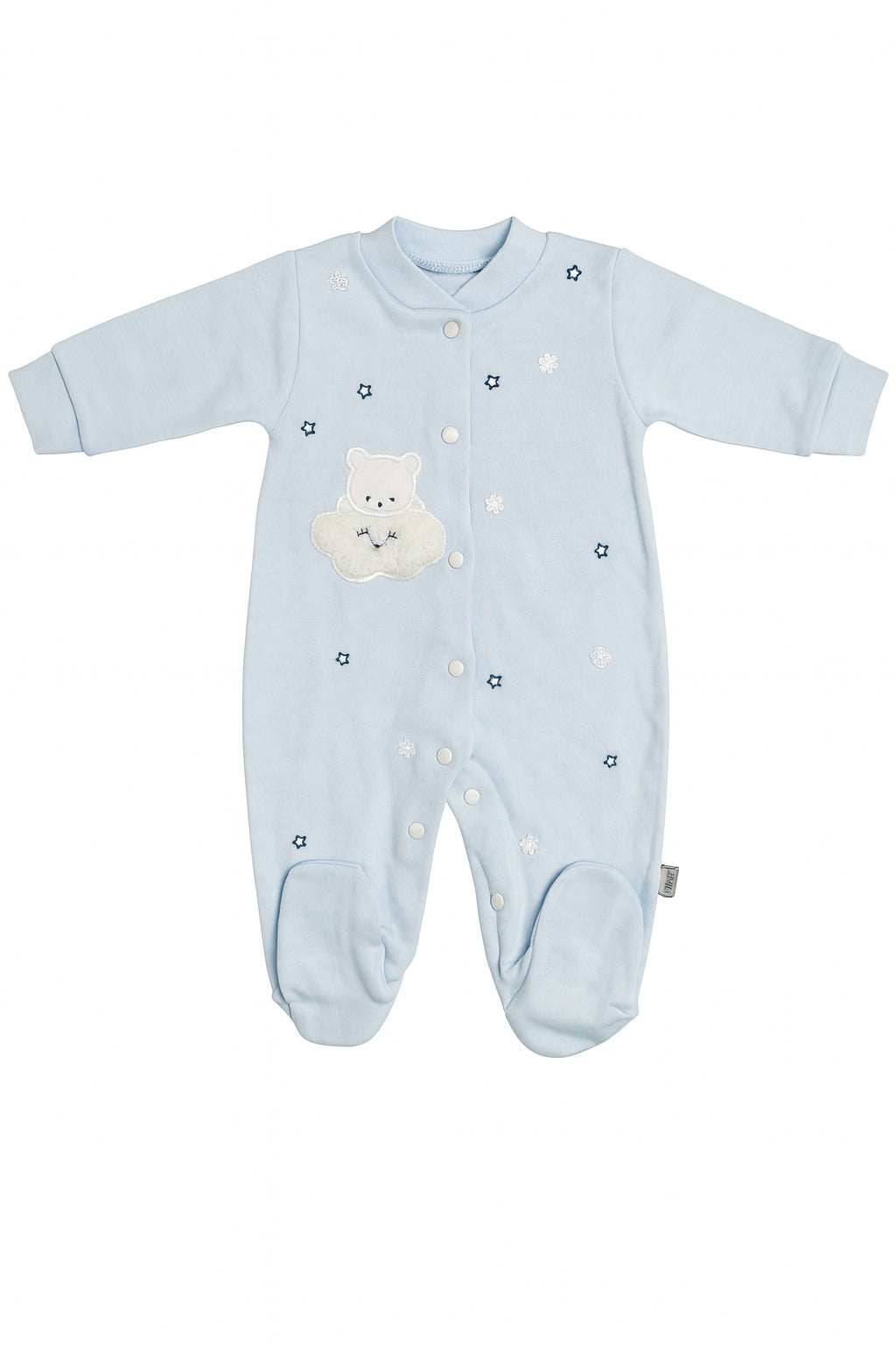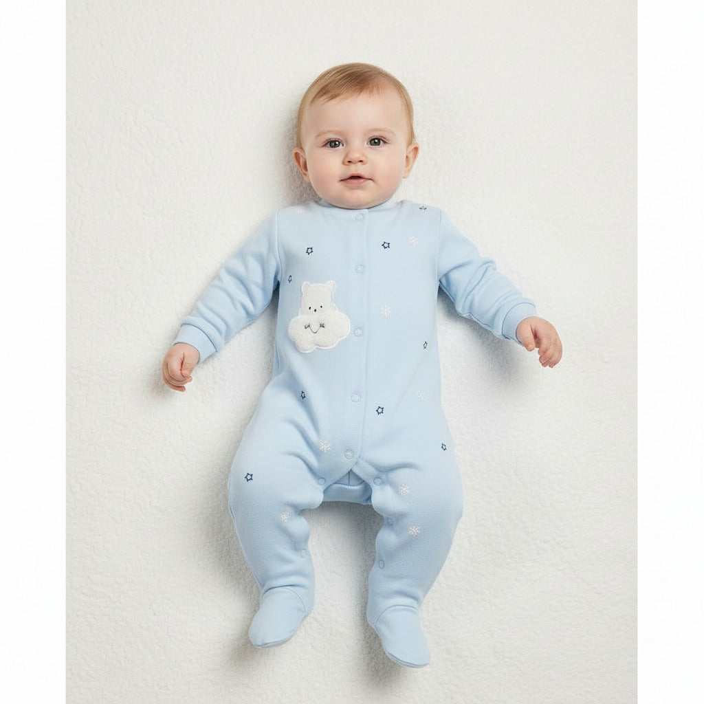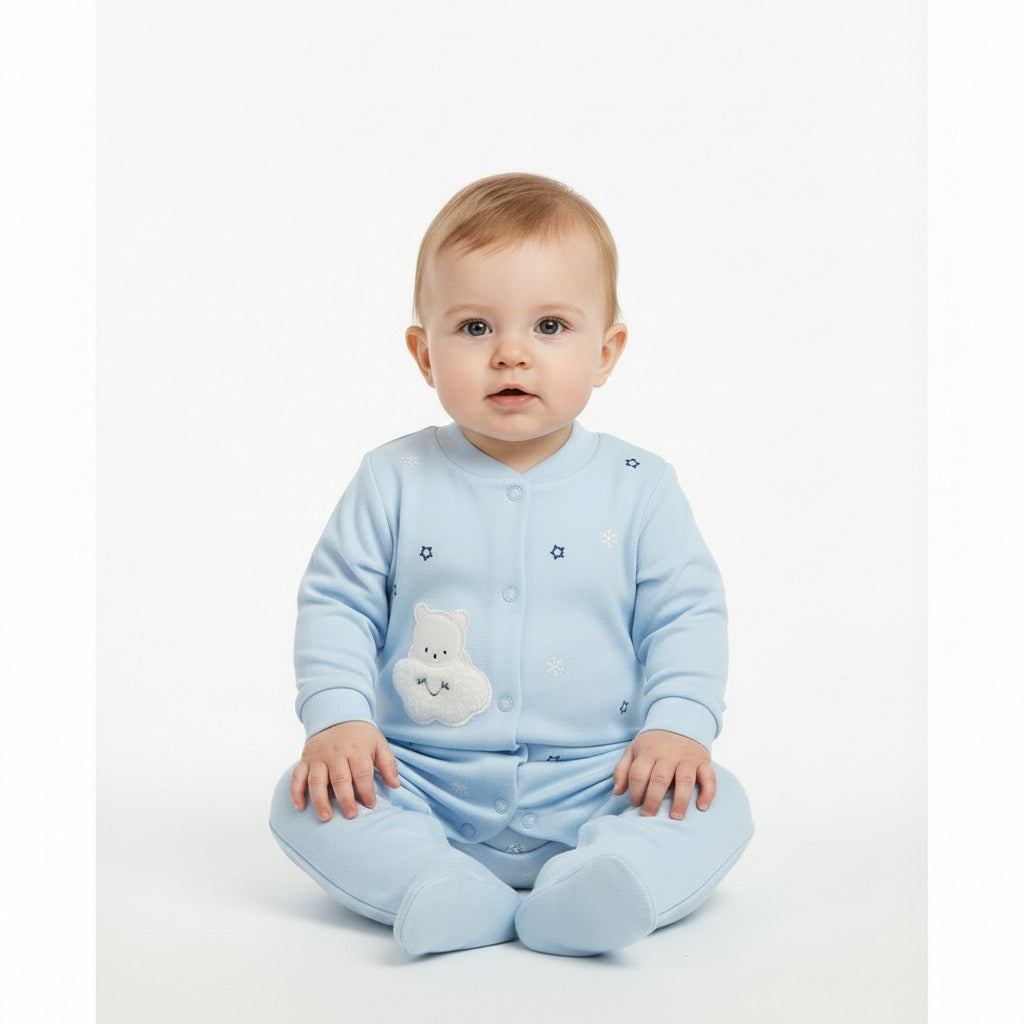Създаден за пълноценен комфорт през целия ден и нощ, гащеризон „Sweet Dreams“ съчетава изключителна мекота, нежен дизайн и практичност за най-малките. В красив светлосин нюанс с деликатни бродирани звездички и сладко мече, той е идеален както за сън, така и за ежедневни гушки и игри.