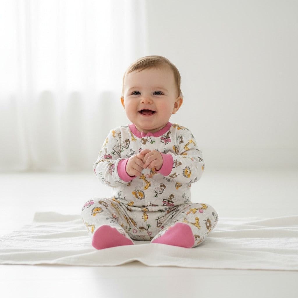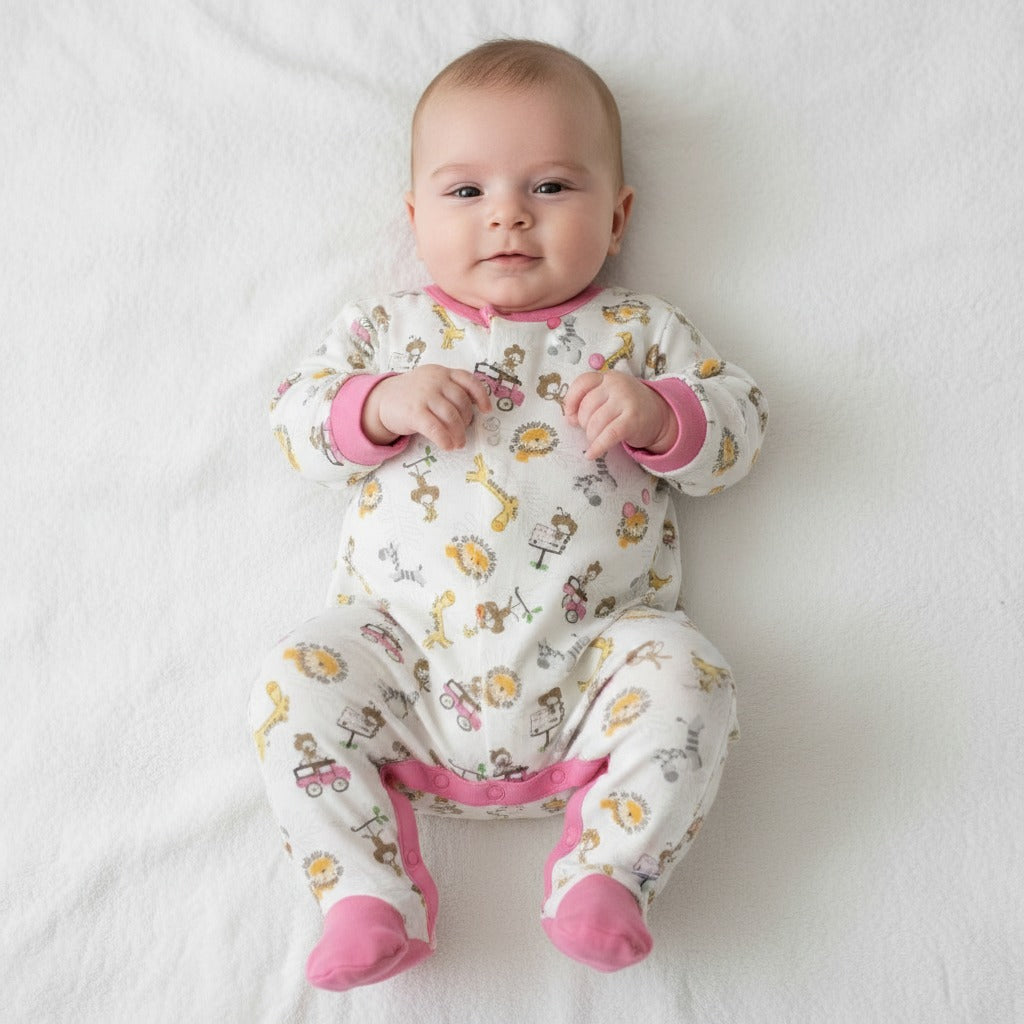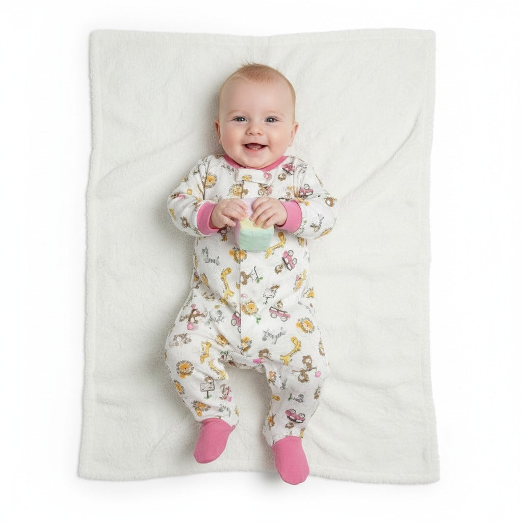 Нежният розов цвят и бродираните детайли с пеперуди създават усещане за чистота, топлина и бебешка приказка, а вградените крачета осигуряват допълнителен комфорт и топлина.