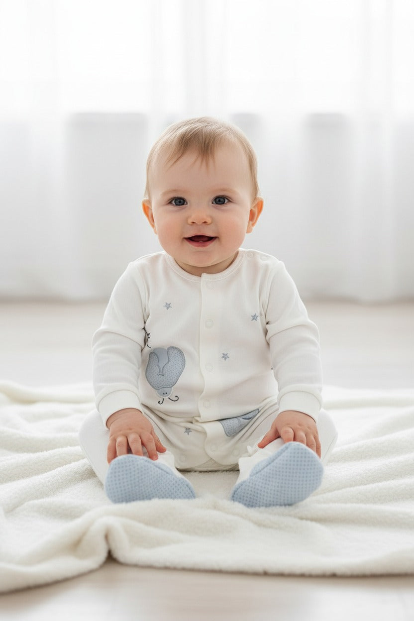 Нежният дизайн в кремаво-бяло създава усещане за чистота, спокойствие и топлина, а затворените крачета с мек светлосин акцент поддържат комфорт през целия ден.