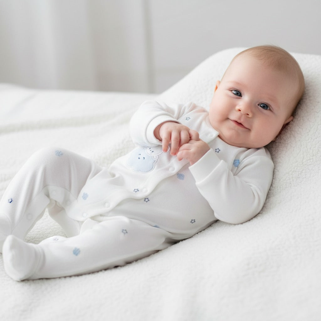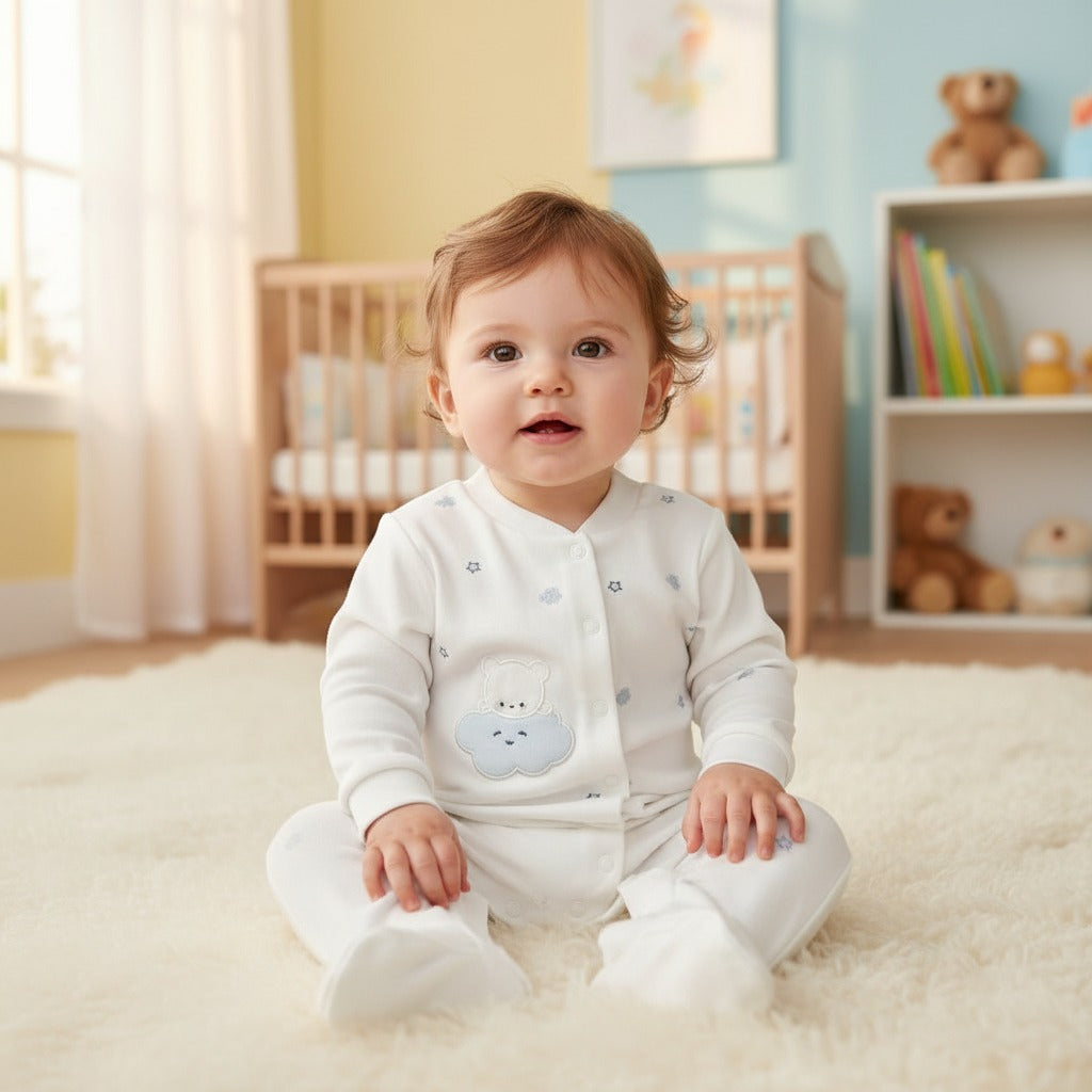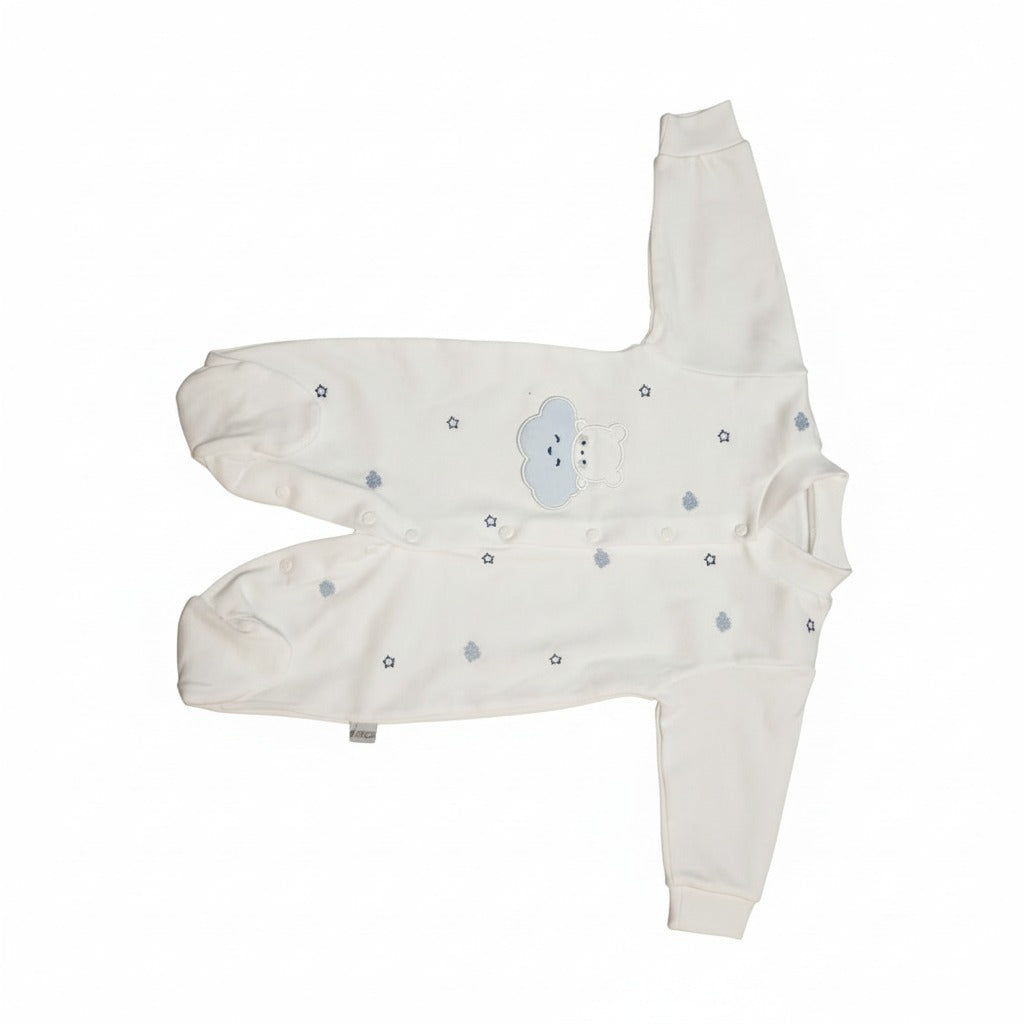 Създаден за пълноценен комфорт през целия ден и нощ, гащеризон „Cloud Dreams“ съчетава изключителна мекота, нежен дизайн и практичност за най-малките. В изискан млечнобял цвят със сладко бродирано меченце върху облаче и фини сини звездички, той е идеален както за сън, така и за уютни моменти у дома.
