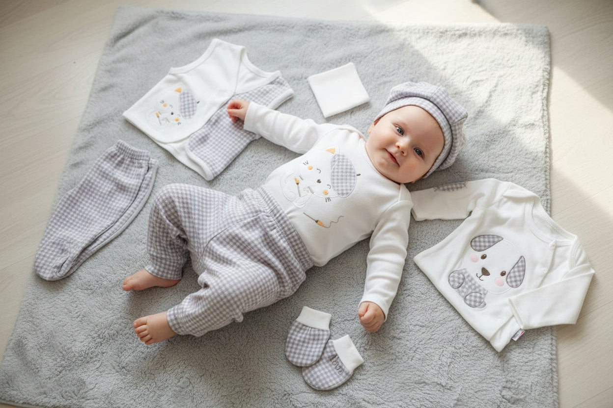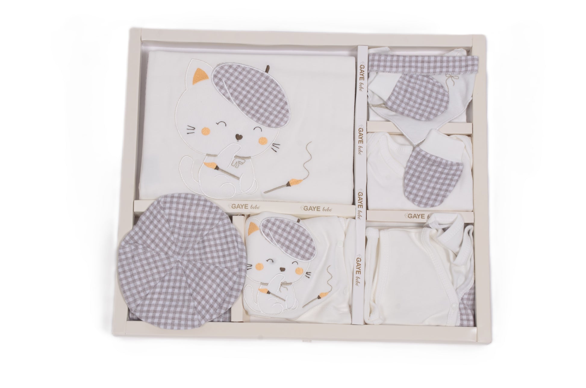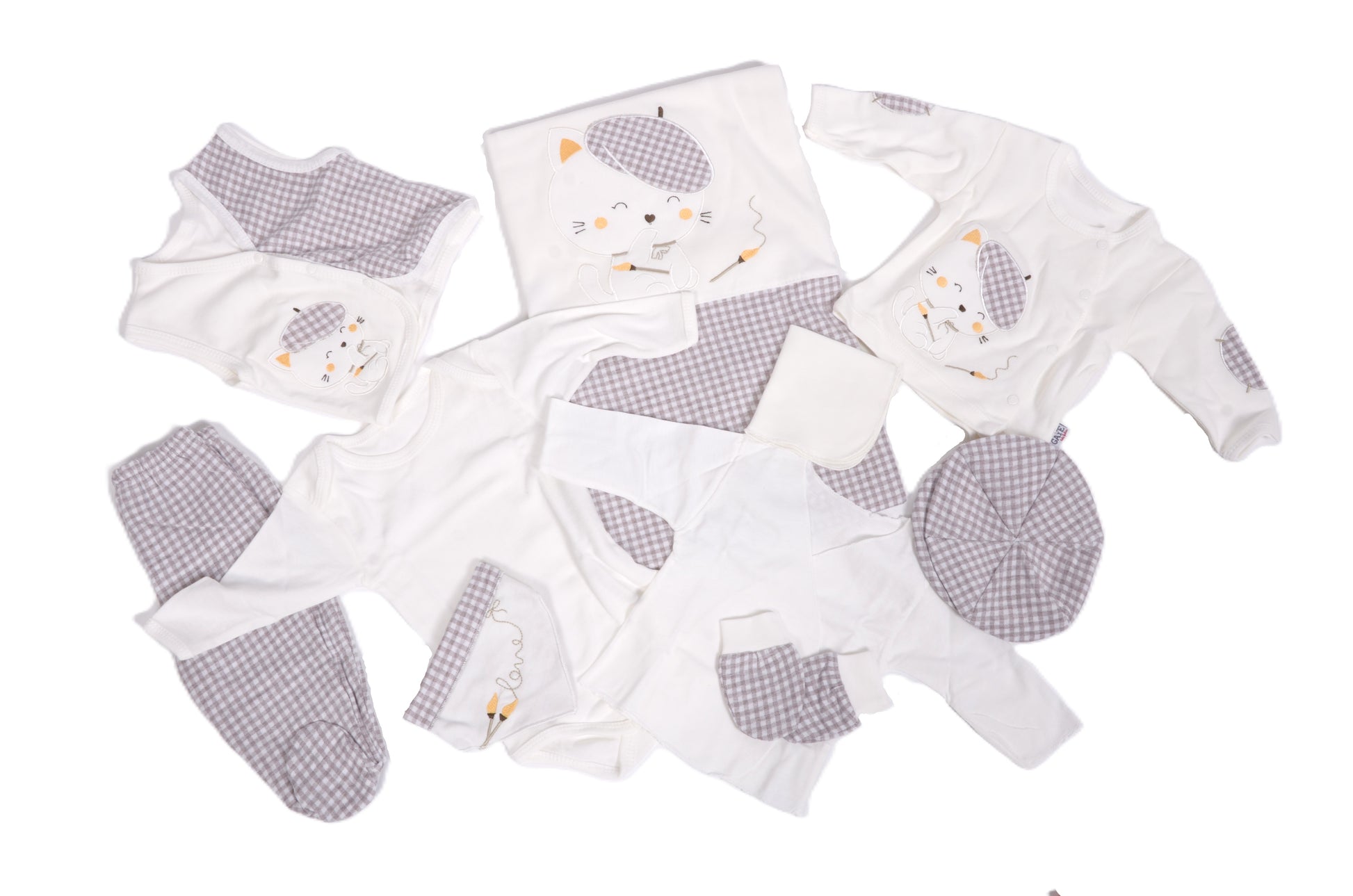 Очарователен 10-частен комплект за изписване, изработен от нежен и висококачествен 100% памук, който осигурява максимален комфорт и грижа за чувствителната бебешка кожа. Комплектът е в мека комбинация от бяло и светлосиво каре, с прекрасна апликация на котенце с барета – идеален избор за първите дни на вашето бебче.