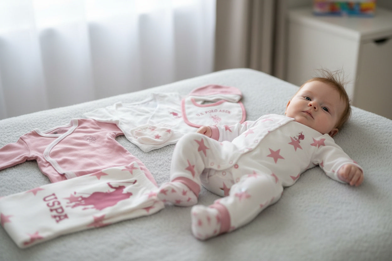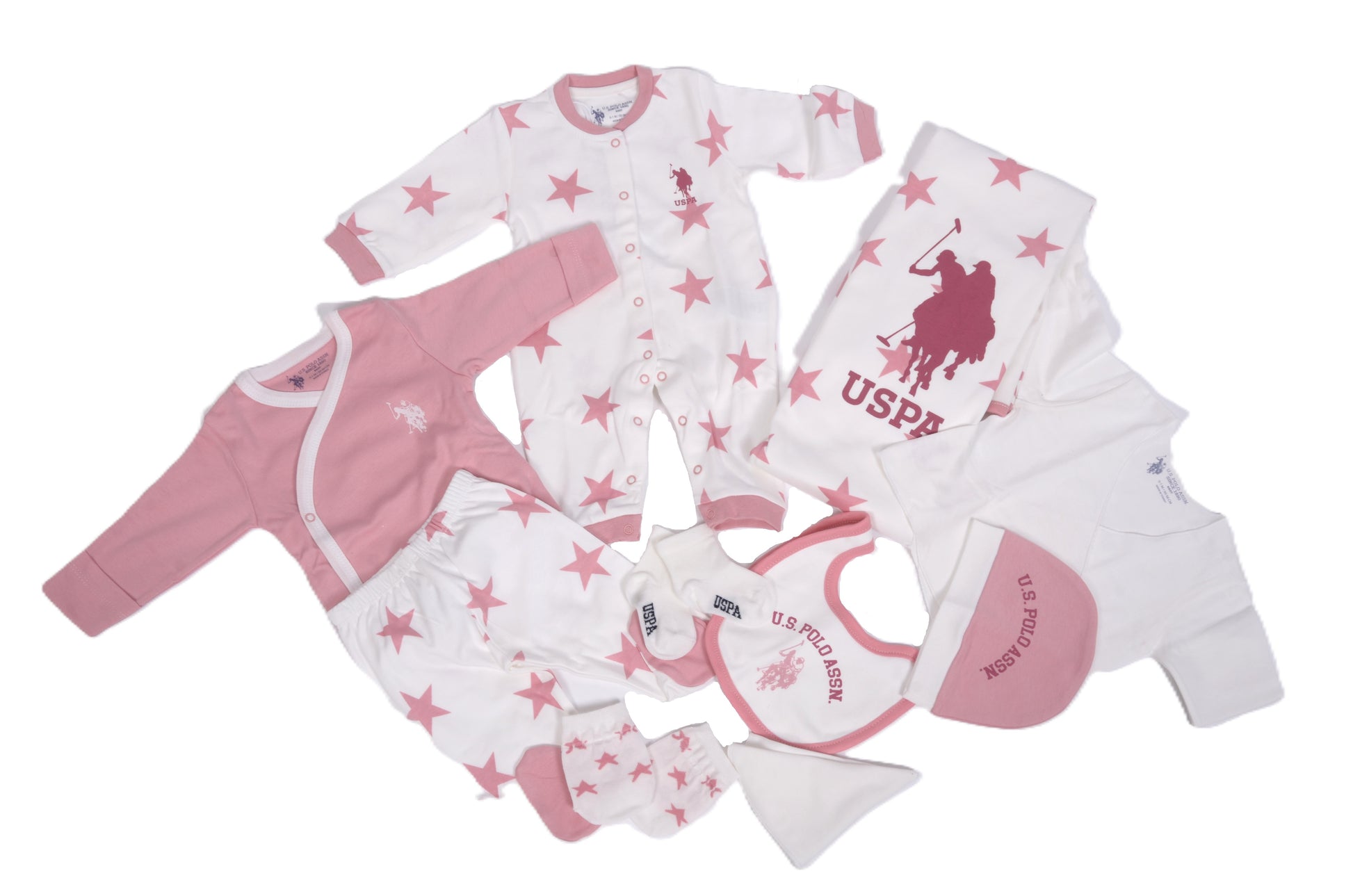 Луксозен 10-частен комплект за изписване от U.S. Polo Assn., изработен от висококачествен 100% памук, който осигурява мекота, комфорт и грижа за чувствителната бебешка кожа. Дизайнът в бяло и розово с нежни звездички и емблематичния логотип на марката придава изтънчен и стилен вид – идеален избор за първите дни на вашето момиченце.