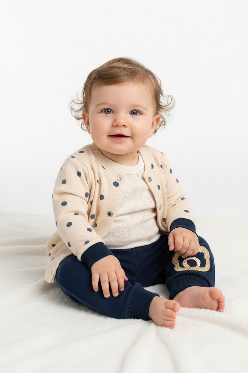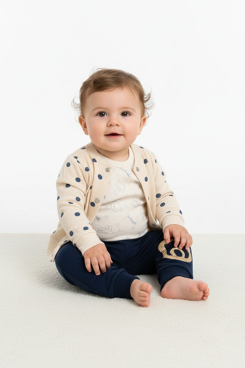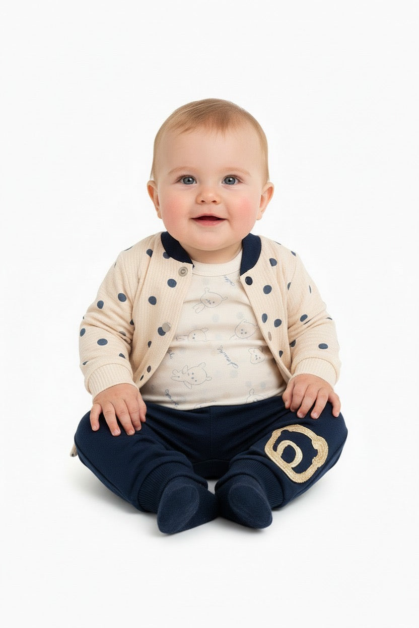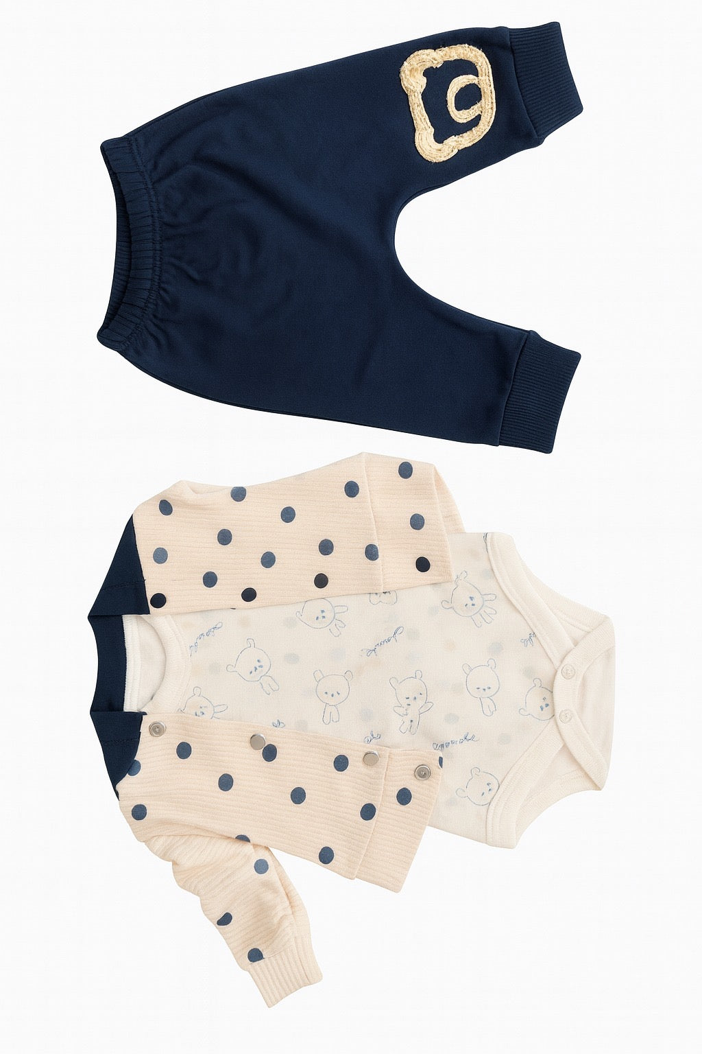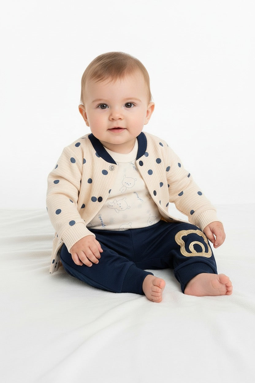 Подарете на вашето бебче истински комфорт с този очарователен комплект, съчетаващ нежна жилетка на точки, памучно боди с мечета и меки панталонки с апликация 🐻.