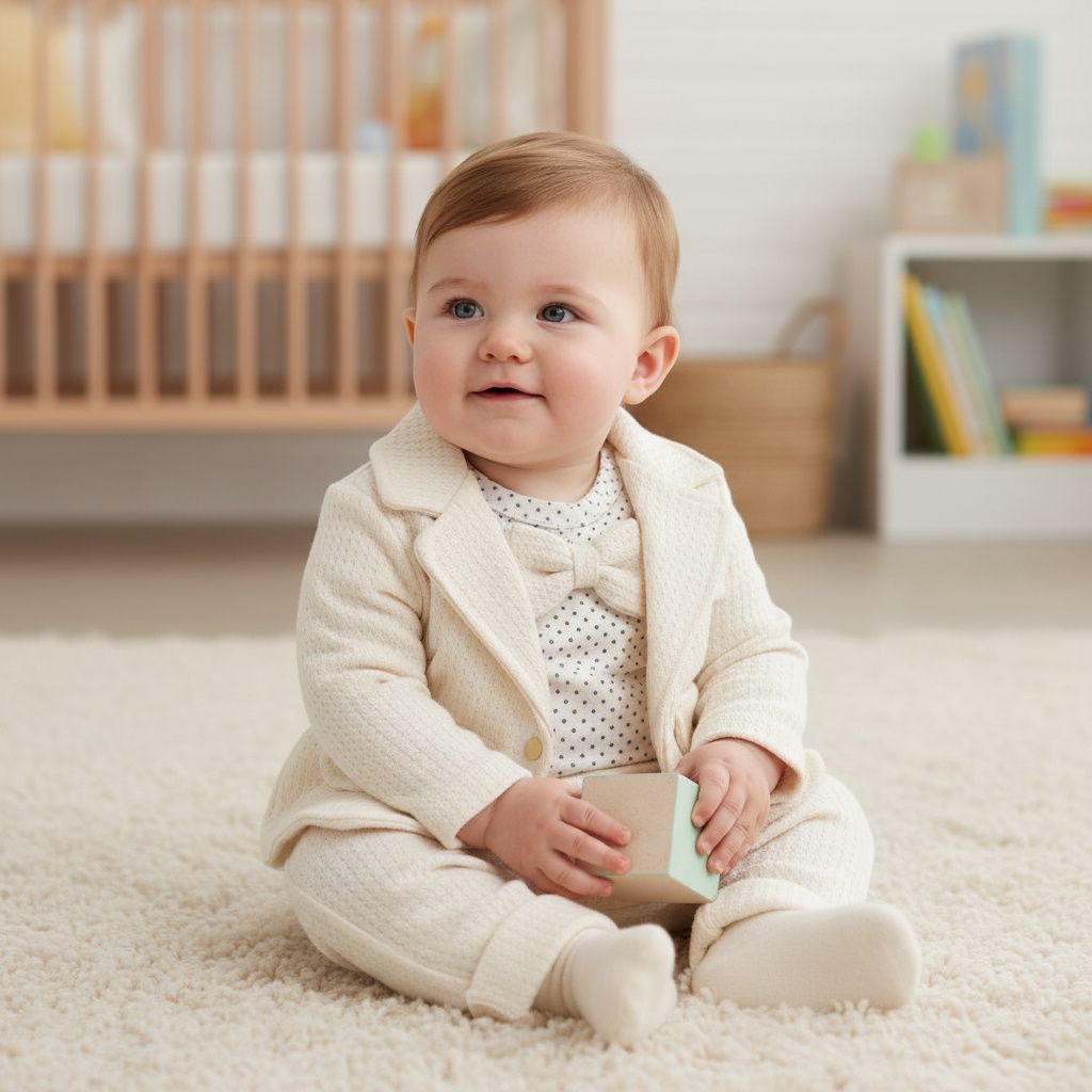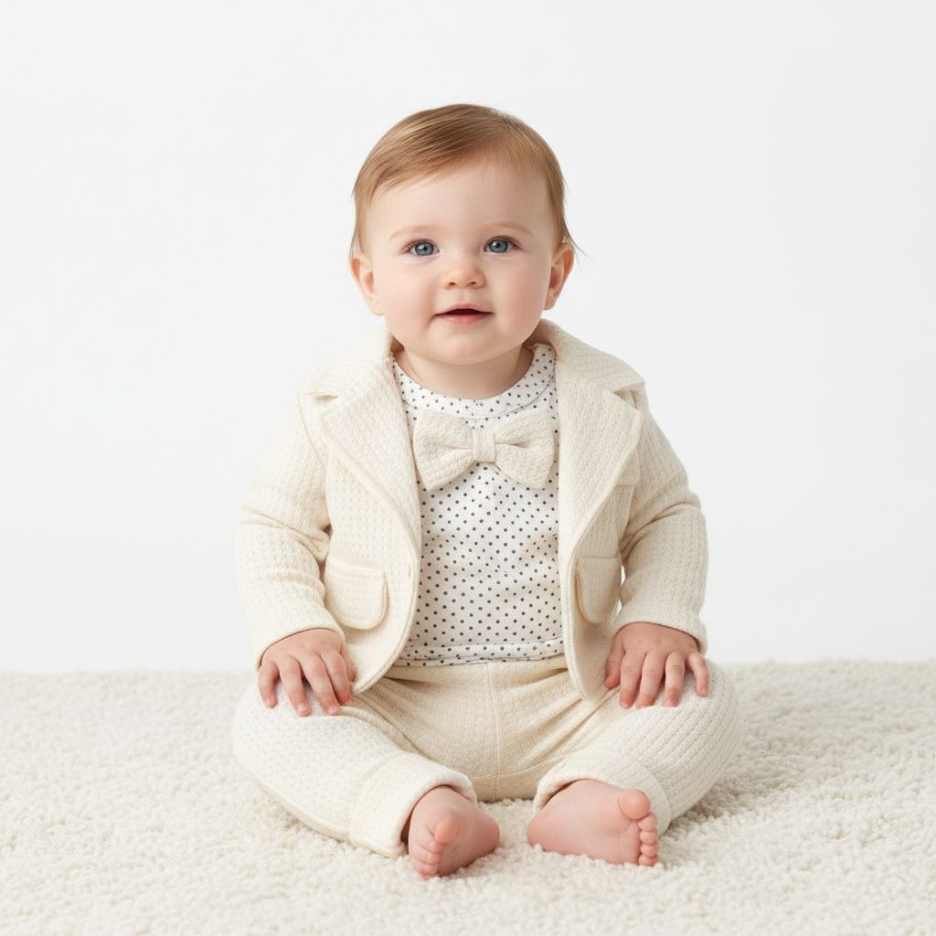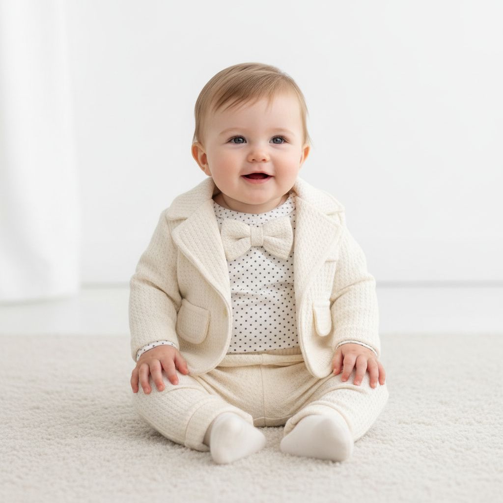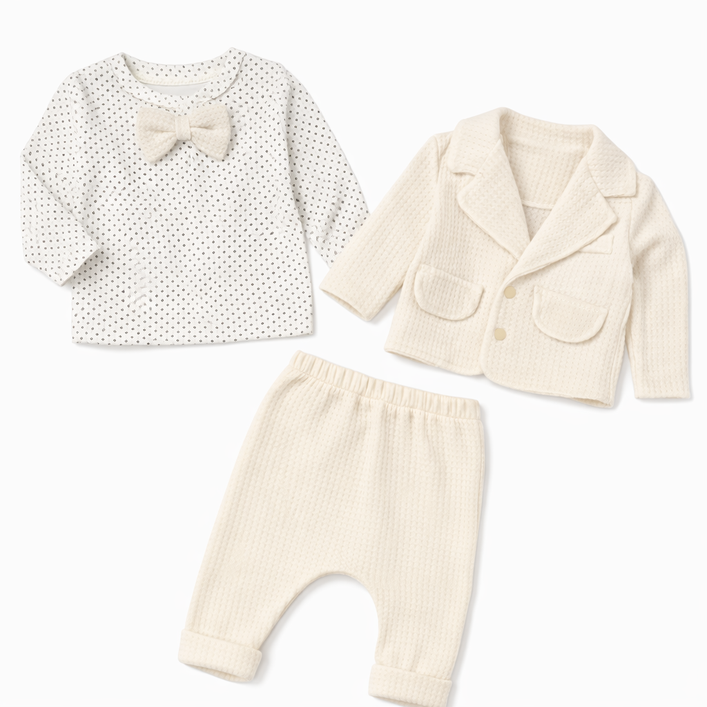 Нежен и изискан бебешки комплект, създаден за малки джентълмени. „Little Gentleman“ съчетава удобство и елегантна визия, подходяща както за специални поводи, така и за стилни ежедневни разходки.
