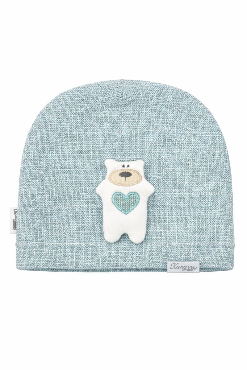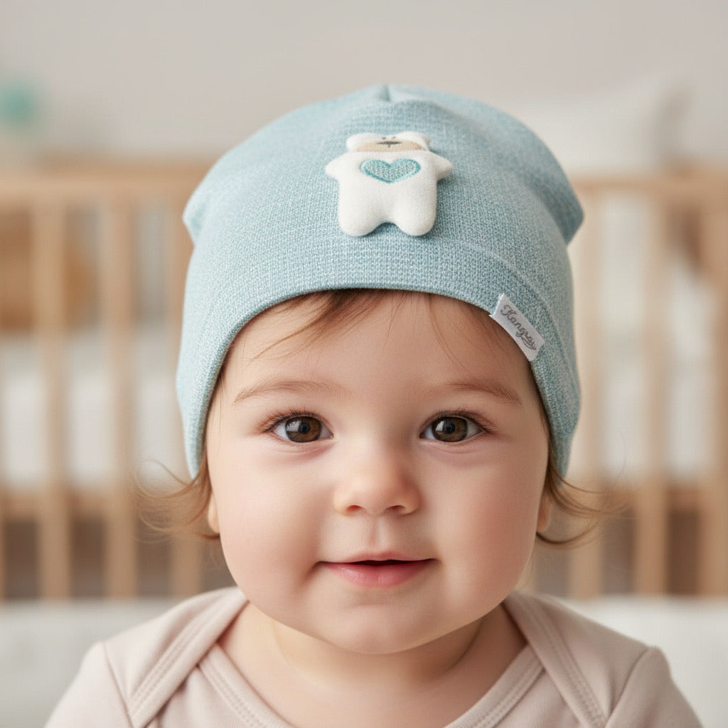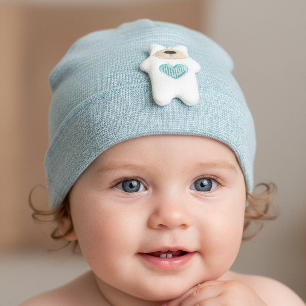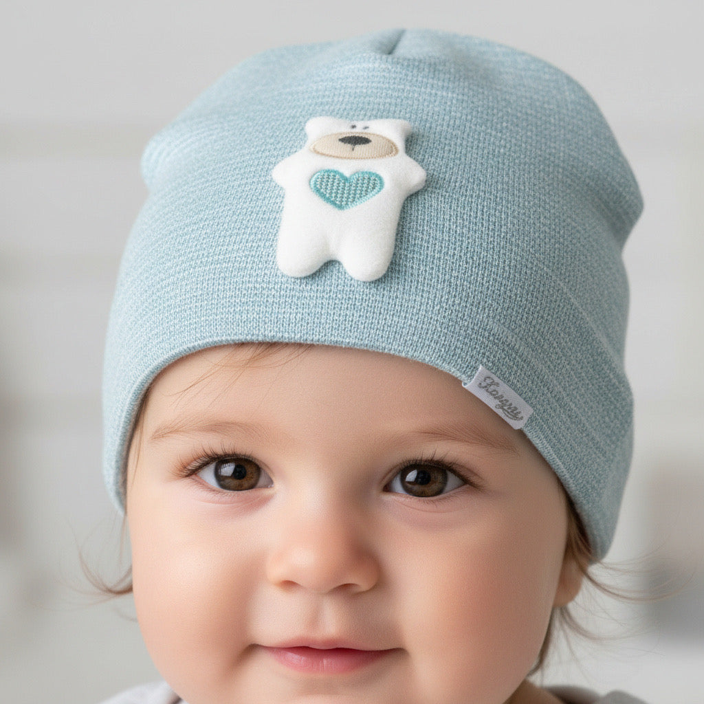Очарователна бебешка шапка в светло син нюанс, създадена да осигури комфорт и защита за малките главички. Декоративната апликация с мече и сърчице придава сладък и уютен завършек.